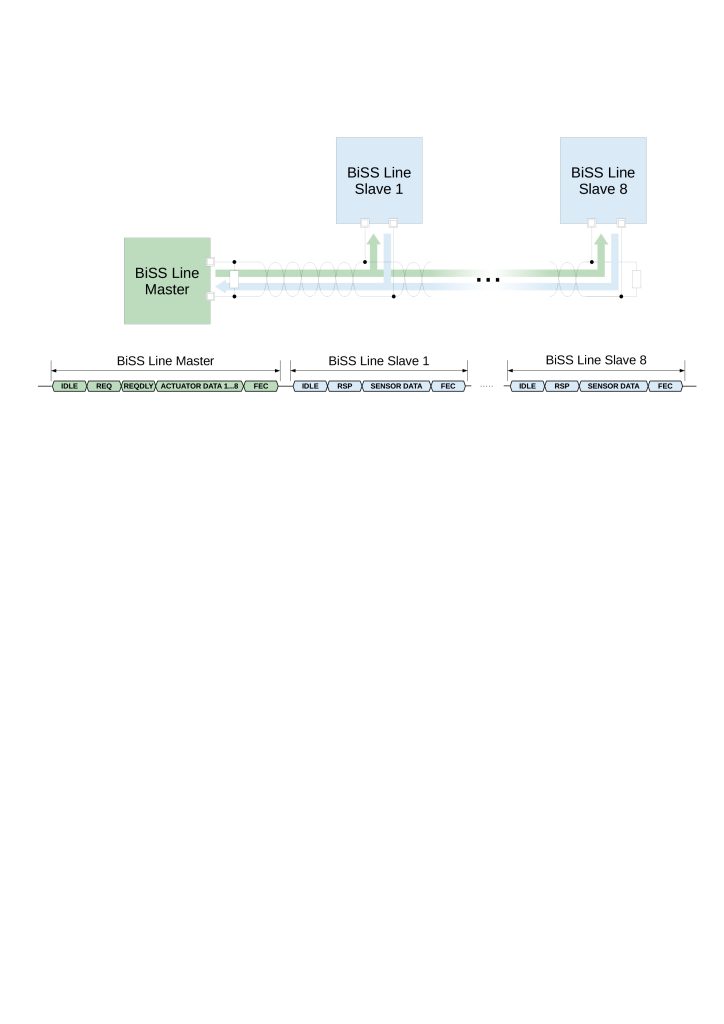 Biss Line unterstützt Bustopologien mit bis zu acht Teilnehmern. Jeder Slave kann dabei Aktordaten vom Master empfangen und Sensordaten an ihn senden. In jedem Biss Line Slave sind mehrere Sensoren und Aktoren implementierbar. Insgesamt werden in einem Biss Line Bus bis zu acht logische Datenkanäle für Biss-, SSI- und SPI-Sensoren bzw. Aktoren unterstützt. I2C-Sensoren können unabhängig von den Datenkanälen per BiSS Registerkommunikation ausgelesen werden.