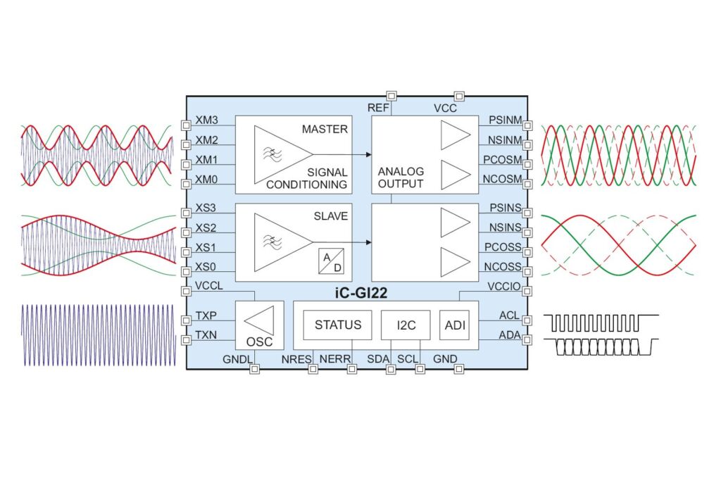 Der zweikanalige induktive Sensor-IC iC-Gi22 mit Sin/Cos- und interpoliertem SSI-Datenausgang von IC-Haus wird für die magnetische Off-Axis-Positionserfassung mithilfe eines einfachen Metallziels verwendet. Das Gerät ermöglicht eine absolute Winkelerfassung über die gesamte mechanische Umdrehung durch Abtastung zweier separater Kanäle (Master plus Slave). Die demodulierten Empfängersignale speisen den externen Prozessor, das heißt ein geeignetes Interpolationsgerät wie iC-MNF, iC-TW29, iC-NQE und eine MCU mit ADCs, um die Position mit höherer Auflösung zu bestimmen.