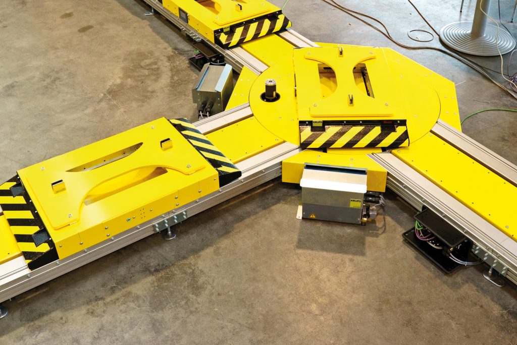 Ein deutscher Automobilhersteller setzt das neue Fördersystems als einer der ersten Anwender künftig in seiner Batteriefertigung für Elektromobile ein. Um nicht mit jeder Anlage das Rad neu erfinden zu müssen, setzt Krups auf ein Baukastenkonzept. Das System besteht aus wenigen standardisierten Modulen: Drehmodule, Quershuttle, Stopper und Indexierer. Diese Einheiten werden für die Anforderungen des Kunden individuell zu einem Layout zusammengestellt und vor Ort an dessen Anlagensteuerung angebunden. Das Fördersystem liefert dem Produktionssystem des Kunden Reportdaten und ermöglicht bidirektionale Kommunikationsschnittstellen. „Früher gab es immer eine Hauptsteuerung, zu der alle Signale geführt wurden. Teilweise noch in Punkt-zu-Punkt-Verdrahtung, immer häufiger aber auch mit dezentralen I/O-Einheiten. Das Problem war dabei die Programmierung. Klassischerweise programmiert ein Anlagenprogrammierer alles in einer Schrittkette. Wenn jetzt aber irgendeine Bedingung zum Einschaltzeitpunkt oder nach einem Notanlauf auftritt, die nicht in dieser Schrittkette abgebildet ist, dann müssten die Anwender manuell Einheiten verschieben, um wieder ein bekanntes Bild zu haben“, erklärt Christian Mies, Steuerungsentwickler bei Krups. Damit manuelle Eingriffe nicht nötig werden, müsse ein Fördersystem anders programmiert werden. „Man schafft Bedingungen und definiert dazu Reaktionen, die für alle Situationen passen.“ Wenn die Steuerung der Module in der Gesamtsteuerung stattfindet, nehmen Kunden hier teilweise Änderungen vor, die den Gesamtablauf stören. Treten in der Folge Störungen auf, fallen diese auf den Krups zurück – obwohl die Firma dafür nicht verantwortlich war. Diese Erfahrung hat gelehrt: Im Idealfall steuert sich jedes Modul autark.