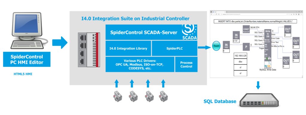 Eine zentrale Funktion der Betriebsdatenerfassung ist auch die Anbindung an bestehende Softwareapplikationen aus der IT-Welt. Dies umfasst beispielsweise das Sichern der Daten in SQL-Datenbanken, aber ebenso die Weiterleitung an bestehende Applikationen wie ein ERP (Enterprise Ressource Planning) oder an die Buchhaltung. Der SpiderControl Scada-Server wurde deshalb um die SpiderPLC erweitert. Die SpiderPLC ermöglicht die grafische Programmierung von FUP (Funktionsplan) direkt im Browser und verfügt über eine umfangreiche Bibliothek von Funktionsbausteinen, um die Daten aus der Steuerungsebene direkt mit Applikationen aus der IT zu verbinden. Insbesondere für den Fernzugriff – etwa im Störungsfall – ist die rein browserbasierte Programmierung ein Vorteil. Die Kombination der drei Softwarepakete PC HMI Editor, Scada-Server und SpiderPLC nennt man deshalb bei IniNet Solutions auch I4.0 Integration Suite, weil damit ein gesamteinheitliches und durchgängiges Werkzeug angeboten werden kann, um die beschriebenen Aufgaben effizient und einfach realisieren zu können.