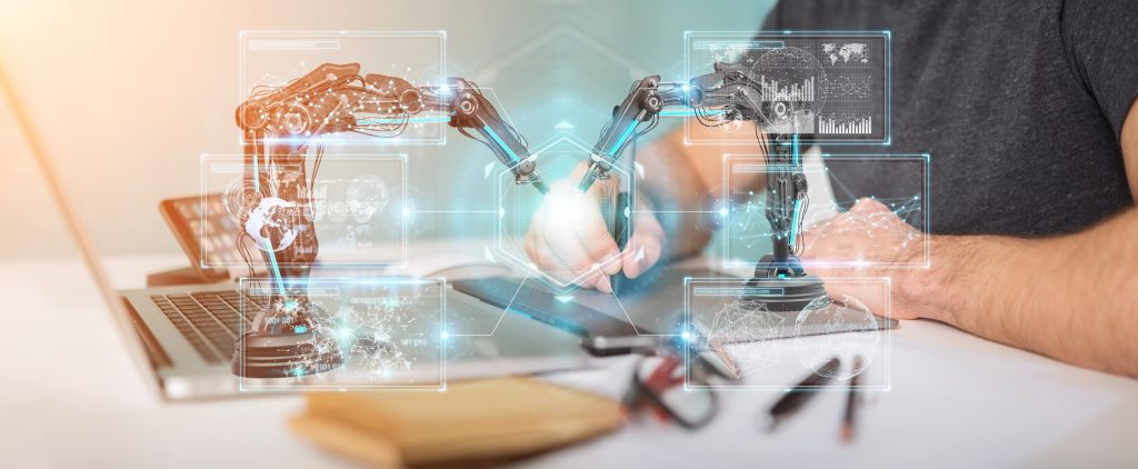 Graphic designer on blurred background using robotics arms with digital screen 3D rendering – Bild: TeDo Verlag GmbH
