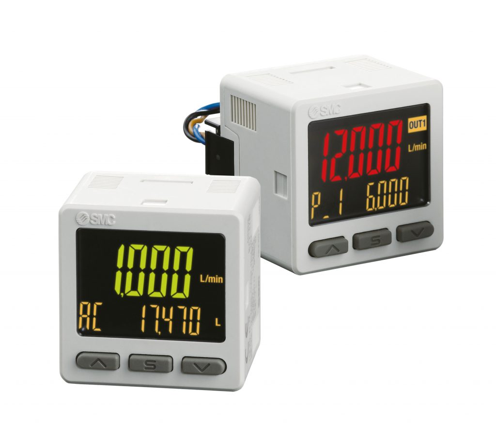 SMC hat alle digitalen Druckschalter der Serien ZSE/ISE auf ein zweizeiliges Display umgestellt. Bei den externen Durchflussanzeigen der Serie PFG300 wurden Anzeige und Sensorik komplett voneinander getrennt. Sie können unabhängig an verschiedenen Einbaupositionen einer Anlage angebracht werden, denn die Bedienung von einer prozessunabhängigen Stelle aus ist möglich. Als Anzeigewert für die zweite Zeile kann zwischen kumuliertem Volumenstrom, Hysteresewert, dem Höchst- oder Tiefstwert sowie dem Schaltpunkt gewechselt werden. Die Durchflussanzeigen sind für Volumenströme bis 12.000l/h geeignet. Kompatibel sind sie mit den Sensoren der Serien PF3A7, PFMB und PFMC. Am Schaltausgang ist die Polarität zwischen NPN und PNP wählbar. Über eine Kopierfunktion lassen sich alle Einstellungen vom Master an weitere Einheiten im System übertragen, unerlaubter Zugriff wird durch einen PIN-Code verhindert, eine Energiesparfunktion reduziert die Stromaufnahme.
