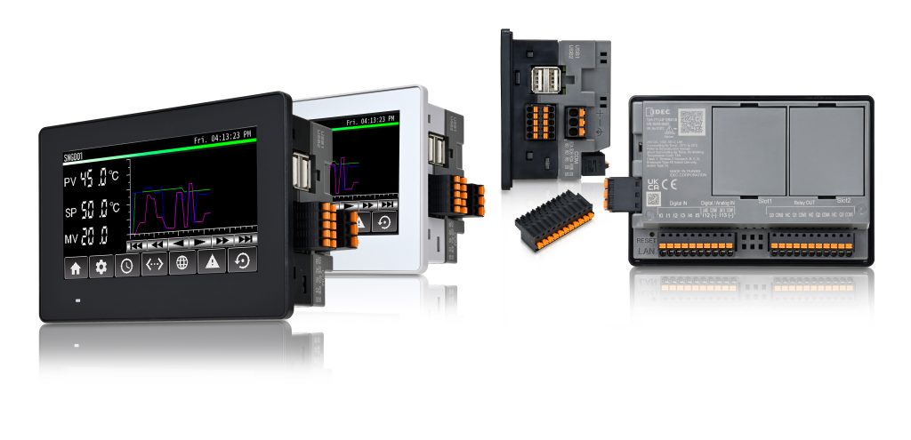 Mit den Serien FT1J und HG1J hat APEM/IDEC zwei leistungsstarke und kompakte Touchpanel-Lösungen auf den Markt gebracht, die für Steuerungs- und Überwachungsaufgaben in platzbeschränkten Industrieumgebungen ausgelegt sind. Das Modell FT1J kombiniert als integrierte Automatisierungslösung Steuerung und Bedienerschnittstelle in kompaktem Design. Im Vergleich zu herkömmlichen Kombinationen aus SPS und HMI wird laut Hersteller nur die Hälfte der Einbautiefe benötigt. Das Gerät bietet ein immersives 4,3″-Display mit hoher Helligkeit. Das batterielose Design macht Einweg-Lithiumbatterien überflüssig. Der Touchscreen unterstützt Multitouch-Erkennung, kann auch mit Gummihandschuhen bis 1,5mm Dicke bedient werden und ist durch die Glasoberfläche widerstandsfähig gegenüber Umwelteinflüssen. Durch Verwendung von PCAP-Technik wird eine unbeabsichtigte Aktivierung durch Wassertropfen verhindert. Das Gerät kann im Hoch- oder Querformat verwendet werden. Die Serie FT1J ist staubdicht sowie gegen Strahlwasser geschützt (IP66F/IP67F) und kann in einem Temperaturbereich von –20 bis +55°C eingesetzt werden. Auf Seite der Schnittstellen stehen Ethernet-, RS232C-, RS422/485- und USB-A-Anschlüsse bereit. Durch die Unterstützung von Protokollen wie Ethernet/IP und Modbus TCP kann die FT1J-Steuerung als Gateway zwischen Produktionsstandort und Cloud fungieren. Für IoT-Anwendungen ist MQTT verfügbar, für die Gebäudeautomation Bacnet. Mit der integrierten analogen I/Os können Signale von 0 bis 10VDC oder 4-20mA mit 12Bit-Auflösung gesteuert werden. Durch die PID-Steuerung ist ein präzises Temperatur-, Durchfluss- und Druckmanagement möglich. Bis zu zwei digitale/analoge I/O-Module sorgen für eine einfache Erweiterung auf bis zu acht digitale und vier analoge I/Os. Mit dem Schwestermodell FT2J bietet APEM auch eine 7″-Variante an.