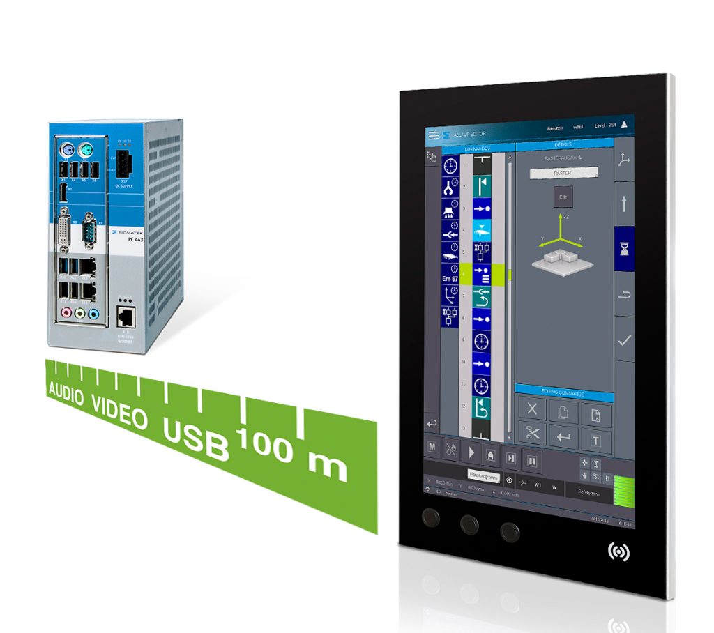Das Multitouch-Panel TAE 2343 und der Industrie-PC 443-W von Sigmatek verwenden HMI-Link für eine Datenübertragung auf Entfernungen bis zu 100m. Der leistungsstarke PC 443-W verfügt über einen Intel- Celeron-Dual-Core-Prozessor mit 2,7GHz, 4GB DDR3-RAM-Arbeitsspeicher und eine 128GB-SSD. Zusätzlich zum HMI-Link stehen folgende Schnittstellen bereit: 2x Gigabit-Ethernet, 6x USB2.0, 2x USB3.0, 2x PS/2 für Tastatur bzw. Maus und je eine Schnittstelle für RS232, Audio, DVI und Displayport. Das Bedienpanel TAE 2343 mit 23,8″-Multitouch-Screen eignet sich für anspruchsvolle Visualisierungsaufgaben. Mehrfingergesten wie Zoomen, Wischen und Weiterblättern sorgen für Bedienkomfort und vermeiden zudem Eingabefehler durch gleichzeitiges Drücken von zwei Bedienfeldern.