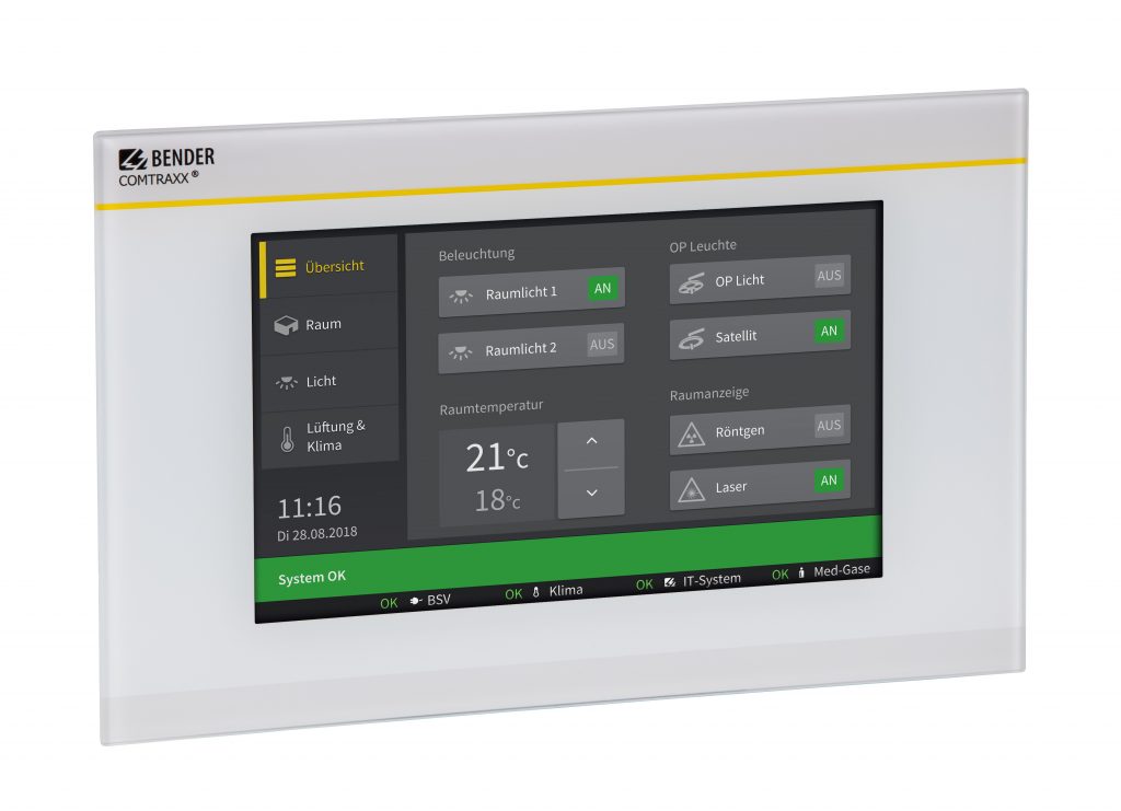 Die Melde- und Bedientableaus Comtraxx-CP9xx-Serie von Bender sollen dazu dienen, jederzeit den Überblick über alle angeschlossenen Systeme zu behalten. Sie alarmieren im Fehlerfall und sichern die komfortable Anlagensteuerung. Das Bedientableau ist in 7, 15,6 und 24″ als Touchscreen mit einer Glasfront erhältlich. Der für Alarmmeldungen unerlässliche Summer kann in drei Lautstärkestufen eingestellt und von jedem Tableau aus quittiert werden. Vordefinierte Widgets können Informationen visualisieren, Schaltzustände darstellen und Aktionen auslösen. Die Steuerung von OP-Leuchten und die Überwachung von BSV-Anlagen sind ebenso möglich.