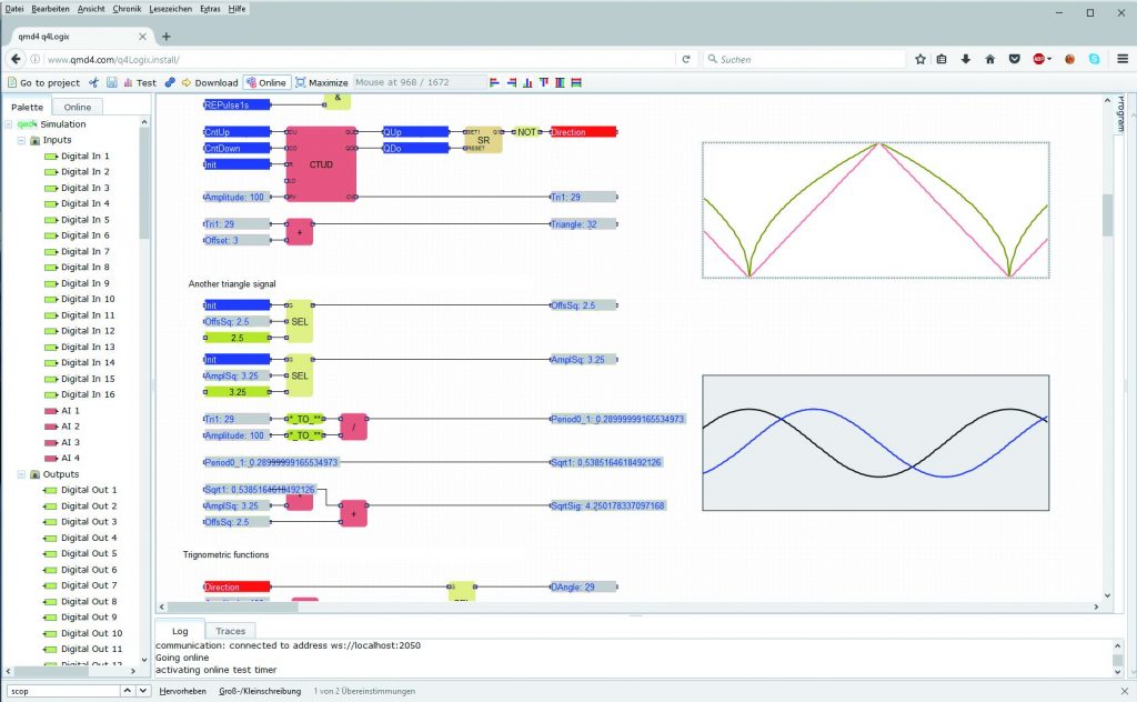 Web-Applikationen sind in der IT bereits seit einigen Jahren State-of-the-Art, nicht nur bei klassischen Office-Anwendungen oder Speicherdiensten, sondern auch als Entwicklungsumgebungen im Bereich von Web Design und verwandten Anwendungen. Man kann also durchaus von bereits erprobter und zuverlässiger Technologie sprechen. Im Automationsbereich ist bisher die österreichische Softwareschmiede qmd4 mit einer IEC61131-Funktionsplanprogrammierumgebung Vorreiter in diesem Segment. Das Tool q4Logix ist eine Client/Server-Anwendung, deren Kommunikation auf zukunftssicheren Standardprotokollen basiert und somit sicheren Datenaustausch via https oder secure websocket ermöglicht. Die Entwicklungsumgebung läuft ressourcenschonend und benötigt daher nur eine geringe Bandbreite zum Datenaustausch. Die Editierung im Client ist auch ein großer Vorteil gegenüber Applikationen, die auf einem Server laufend Rechenleistung und Bandbreite belegen. Mit q4Logix ist der Einsatz auch bei einer mobilen Anbindung problemlos möglich. Bei q4Logix wird im Browser die entsprechende Programmstruktur per Drag&Drop in der Arbeitsfläche gezeichnet. Neben einer breit gefächerten Auswahl an vorkonfektionierten Funktionen und Funktionsblöcken stehen unterschiedliche Datentypen zur Verfügung. Per Mausklick wird der entsprechende Code für die Laufzeitumgebung (q4PLC) generiert und auf die entsprechende Zielhardware geladen. Das eigentliche SPS-Programm läuft dann wie bei jeder anderen, klassisch programmierten SPS, direkt auf dem Zielsystem. Da die Programmierumgebung auf einem verschlüsselten Web Server läuft (z.B. via SSL) und der Code auf einer gesicherten Verbindung zur Zielhardware übertragen wird, können Sicherheitsbedenken entkräftet werden. q4Logix dient zur high-level Programmierung auf der Basis von Systembausteinen des Hardware- und Systemlieferanten in Funktionsplan. Diese Systembausteine können in den Sprachen C und Assembler erstellt werden. Weiter gibt es eine Reihe von Bibliotheken von qmd4 z.B. nach IEC61131. Um Vorbehalten von Cloud-Applikationen entgegen zu wirken, bietet qmd4 die Option, q4Logix nicht nur über einen öffentlichen Server zugängig zu machen, sondern zusätzlich die Möglichkeit den entsprechenden Web Server innerhalb einer Firmengruppe einzubinden. Somit kann man zusätzliche Zugriffssicherheit via VPN gewähren und gleichzeitig können alle Teammitglieder innerhalb der Firmengruppe sicher zugreifen. Als dritte Option könnte man die Installation gleich direkt auf der SPS selbst vornehmen. Man verliert durch den Betrieb direkt auf der SPS selbstverständlich den einen oder anderen Vorteil einer Cloud, der Vorteil der Geräte- und Betriebssystemunabhängigkeit bleibt aber komplett vorhanden. Somit gibt es für jede Applikation die passende Möglichkeit in der Umsetzung. Für die Fehlersuche steht ein integrierter Online Debugger zur Verfügung, der wie die gesamte Entwicklungsumgebung im Browser läuft. Dieser zeigt die aktuellen Werte der Variablen an und erlaubt auch eine Änderung zu Testzwecken. Zur Darstellung des zeitlichen Verlaufs können auch direkt im Funktionsplan mehrere Trendansichten oder Trendiagramme dargestellt werden, ein wohl in der Branche einmaliges Feature. Die kurzen Turnaround-Zeiten im Bereich von Sekundenbruchteilen für Codegenerierung und Laden des Programms machen die Fehlerbehebung angenehm und einfacher.