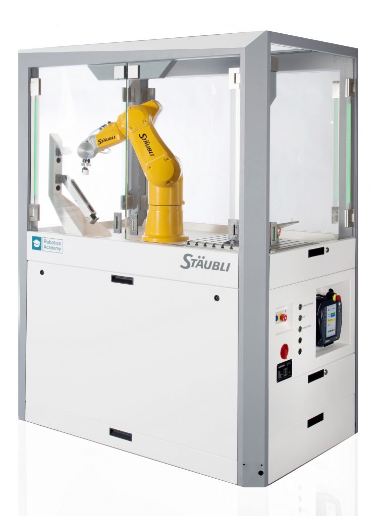 Stäubli hat eine Schulungszelle entwickelt, mit der sich Robotikkenntnisse in kurzer Zeit vermitteln lassen. So sollen Unternehmen, Berufsakademien, Schulen und Universitäten ein modernes Tool erhalten, mit dem sich Kenntnisse wie Bedienen, Teachen und Programmieren einer Roboterzelle schneller und einfacher denn je erlernen lassen. Um den Lerneffekt zu erhöhen, ist die Academia-Box mit der jüngsten Roboter- und Steuerungsgeneration des Unternehmens ausgestattet. Herzstück der Zelle ist der Sechsachser TX2-6, der schnell, leistungsstark und MRK-fähig ist und sich daher für Schulungszwecke eignet. Gleiches gilt für die CS9-Steuerung, die mit vielen Sicherheitsfunktionen aufwartet und somit das komplette Applikationsspektrum vom Standardeinsatz bis hin zur komplexen MRK abbildet.