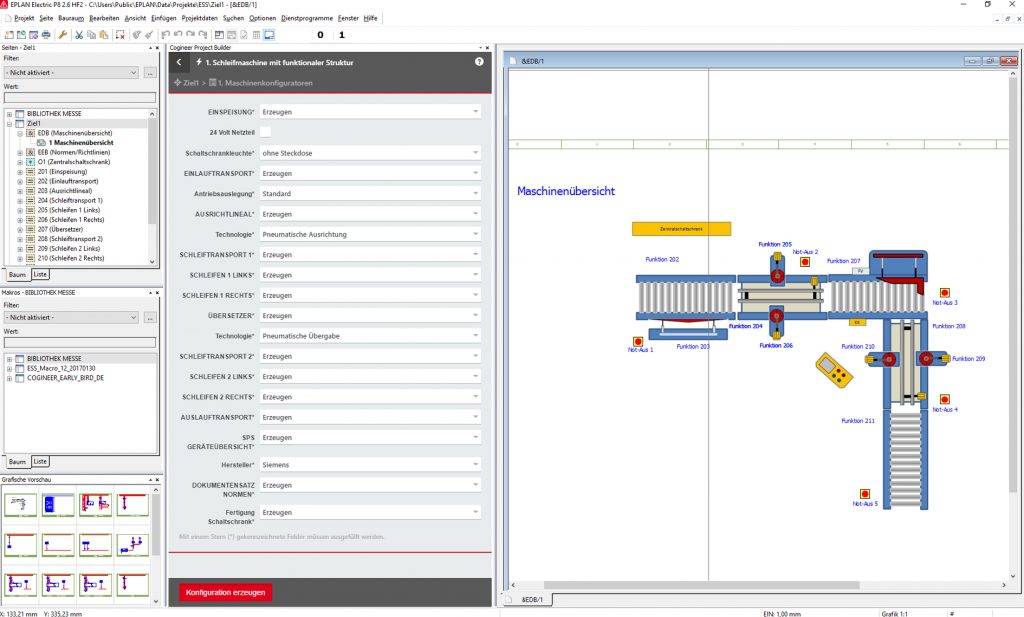 Zur Hannover Messe 2017 stellt Eplan seine neue Automatisierungslösung Eplan Cogineer vor, die vollständig in die Eplan Plattform integriert ist. Die Software wurde komplett neu entwickelt. Mir ihr können Anwender Elektro- und Fluidpläne auf Knopfdruck konfigurieren. Das Besondere daran: Lösungsanbieter Eplan hat hiermit eine Automatisierungssoftware auf Basis von Konfiguration entwickelt, die für Anwender der Eplan Plattform sofort einsetzbar ist. Ohne Hürden und ohne zeitaufwendige Einarbeitung – dafür aber mit extra schnellen Ergebnissen. Erreicht wird dies durch zwei Funktionsbereiche in Eplan Cogineer: Im Designer werden Regelwerke definiert und der Project Builder stellt die automatisch erstellten Benutzeroberflächen für die Konfiguration und automatische Projekterstellung zur Verfügung. Der Project Builder ist von Anwendern ohne jegliche Eplan-Kenntnisse nutzbar. Aber davon später nähere Erklärungen.