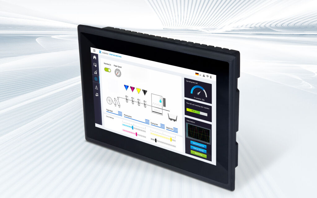 Der Neuzugang im HMI-Portfolio von Sigmatek, das ET 0710, kombiniert kompaktes Design in Kunststoff mit aktueller Prozessorarchitektur und hochauflösendem 7″-Multitouchdisplay. Somit eignet sich das schlanke Bedienpanel für kleinere Maschinen mit begrenztem Platzangebot und preissensitive Anwendungen. Herzstück ist ein Quad-Core-Edge3-Technology-Prozessor mit vier Prozessorkernen (4x 1,6GHz), 2GB LPDDR4 RAM sowie 8GB MicroSD-Speicher. Damit lassen sich auch speicherintensive Web-HMI-Anwendungen flüssig darstellen. Die Bedienung des lüfterlosen HMIs kann – durch projiziert-kapazitiver Glasoberfläche – präzise und intuitiv mit Mehrfingergesten erfolgen. Das 7″-Widescreendisplay mit 1.024×600 Pixel Auflösung stellt Farben und Visualisierungen brillant dar. Für die Visualisierungserstellung stehen im Lasal-VisuDesigner-Tool (HTML5) vielfältige Bedienelemente und Controls zur Verfügung. Das HMI verfügt über je eine Ethernet-, CAN-, USB 2.0 Typ A sowie Typ C und RS485-Schnittstelle. Eine zusätzliche Ethernet-, CAN- und RS232-Schnittstelle bietet das ET 0710-02. Die Variante ET 0710-01 kommt mit 1x Gigabit-Ethernet, 1x Ethernet, 2x CAN, und je 1x USB 2.0 Typ A sowie Typ C, RS232, RS485, LP-Bus und M-Bus. Somit kann der Anwender das Panel bzw. die Schnittstellen passend zur Anforderung wählen und Kosteneffizienz erzielen. Auch das Kunststoffgehäuse trägt zu einem verbesserten Preis/Leistungsverhältnis bei und ist für den industriellen Einsatz designt. An der Front befindet sich eine Multi-Status-LED. Das Web-HMI ist für Einbaumontage im Schaltschrank konzipiert und frontseitig in Schutzart IP65 ausgeführt.