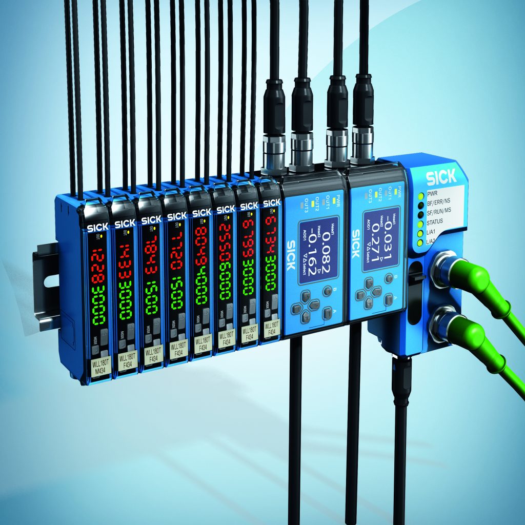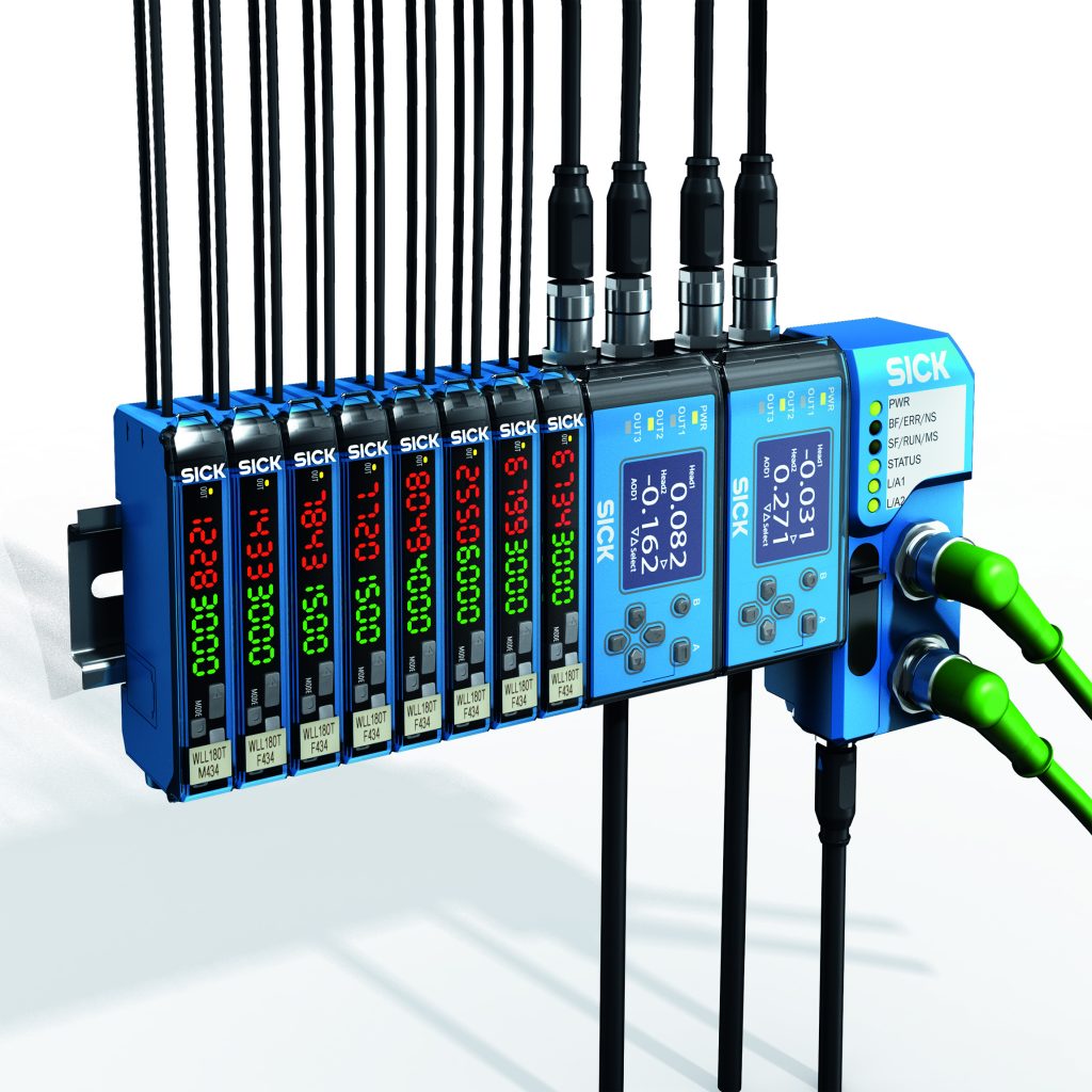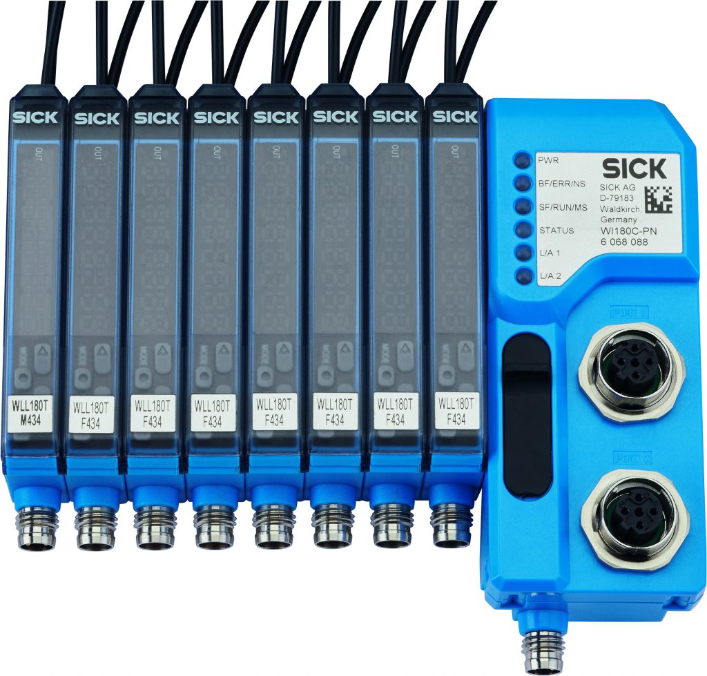 Die neuen WI180C Gateways ermöglichen es, Lichtleitersensoren WLL180T, Kontrastsensoren KTL180 und messende Displacementsensoren wie die OL1 und verschiedene OD-Produktfamilien von SICK über eine einzige Leitung direkt in die IO-Link- oder die Feldbuswelt zu integrieren. – Bild: Sick AG