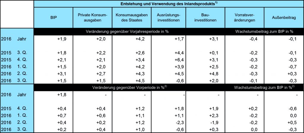 Die deutsche Wirtschaft ist im Jahr 2016 um preisbereinigt 1,9% in einem unruhigen außenwirtschaftlichen Umfeld laut dem Bundesministerium für Wirtschaft und Energie solide gewachsen, nach einem Anstieg des Bruttoinlandsprodukts (BIP) um 1,7% im vorangegangenen Jahr. Die Entwicklung wurde rechnerisch von der Binnennachfrage getragen. Mit der starken Binnennachfrage nahmen die Importe stärker zu als die Exporte. Das positive Jahresergebnis unterstreicht, dass sich die Konjunktur in Deutschland im Jahresschlussquartal 2016 belebt hat. Angesichts der leichten Besserung der Weltkonjunktur haben die deutschen Ausfuhren ihre Schwächephase vom Sommer überwunden. Saisonbereinigt stiegen die Ausfuhren im November um 3,1% gegenüber dem Vormonat an. Die nominalen Einfuhren nahmen mit 3,3% noch stärker zu. Die Produktion im Produzierenden Gewerbe zog im November im Vergleich zum Vormonat um 0,4% etwas an. Die Industrieproduktion erhöhte sich dabei um 0,4% und die Erzeugung im Bauhauptgewerbe um 1,5%. Während sich die Produktion von industriellen Vorleistungsgütern und Konsumgütern belebte (+0,9% und +0,3%), blieb die von Investitionsgütern nahezu unverändert (-0,1%). Im Durchschnitt der Monate Oktober/November produzierte die Industrie 0,8% mehr als im Durchschnitt des dritten Quartals 2016. Im Vergleich der Durchschnitte Oktober/November mit dem dritten Quartal nahmen die Bestellungen in der Industrie um 3,7% zu.