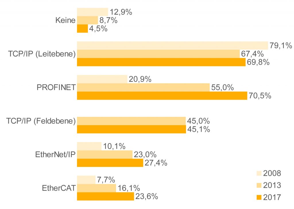 Ethernet-Protokolle sind dabei, herkömmliche Feldbussysteme nach und nach abzulösen: Fast alle Maschinenbauer (96 Prozent) arbeiten mittlerweile mit diesen Technologien. Am meisten verbreitet sind dabei Profinet (heute 71 Prozent / zukünftig 72 Prozent) und TCP/IP auf der Leitebene (70 Prozent / 71 Prozent). Allerdings handelt es sich bei der Umstellung um einen langwierigen Prozess, da auch weiterhin fast drei von vier Unternehmen Feldbussysteme einsetzen werden. Gerade CAN- und ASi-Bus-Nutzer planen weit überwiegend auch zukünftig mit diesen Vernetzungsarten. Eine steigende Rolle nimmt Ethernet im Bereich der funktionalen Sicherheit ein, denn demnächst werden immer mehr Safety-Protokolle auf Ethernet-Basis verwendet.