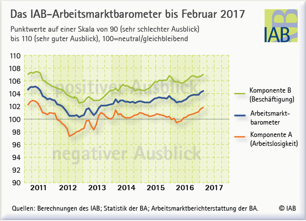 Der Frühindikator des Instituts für Arbeitsmarkt- und Berufsforschung (IAB) zeigt mit 104,4 Punkten einen positiven Ausblick auf die kommenden Monate. Die Komponente für die Prognose der Arbeitslosigkeit stieg im Februar um 0,2 Punkte und liegt nun mit 101,8 Punkten auf dem besten Wert seit Juni 2011. „Die Konjunktur läuft gut, und zudem werden Arbeitskräfte in Deutschland knapper“, sagt Enzo Weber, Leiter des IAB-Forschungsbereichs ‚Prognosen und Strukturanalysen‘. Das Arbeitskräftepotenzial nehme zwar noch etwas zu, aber die Beschäftigung steige deutlich stärker. Für einen weiteren Abbau der Arbeitslosigkeit biete das gute Voraussetzungen. Die Beschäftigungskomponente gewinnt nach einer schwächeren Phase 0,3 Punkte hinzu und steht im Februar mit 107,0 Punkten auf einem hohen Niveau. Die Nachfrage nach zusätzlichen Arbeitskräften sei hoch. Die Besetzung freier Stellen sei jedoch schwieriger geworden, weil die Zunahme der Beschäftigung seit Jahren stärker ausgefallen sei als der Anstieg des Arbeitskräftepotenzials, so Weber. Die positiven Migrationseffekte würden durch den demografischen Wandel gedämpft. Unterm Strich habe sich das ungenutzte Arbeitskräftepotenzial in Deutschland daher verringert. Das Entlassungsrisiko liege auf dem niedrigsten Wert seit der Wiedervereinigung.