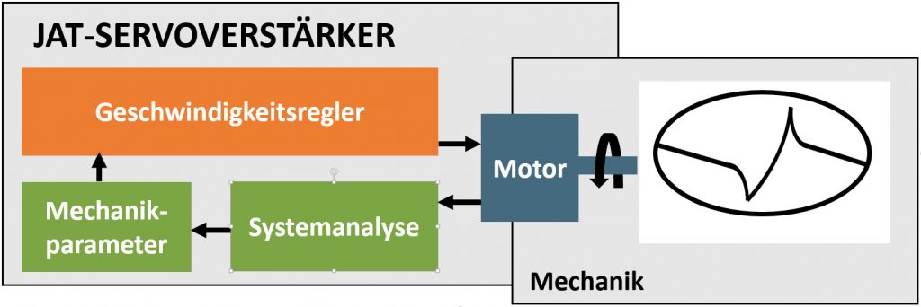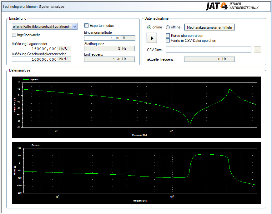 Ein Antriebssystem besteht in der Regel aus einer Leistungselektronik, dem Antriebsmotor und der angeschlossenen Mechanik. Die Mechanik kann starr oder elastisch gekoppelt sein. Typische Mechaniken sind beispielsweise Riemen- oder Spindelachsen. Jede Mechanik wird über entsprechende Kennwerte wie zum Beispiel Trägheitsmoment, Steifigkeit und Kopplungsdämpfung beschrieben und bildet ein schwingungsfähiges System. Im Zusammenspiel aller Komponenten eines Achssystems ergeben sich neue Eigenschaften, welche durch ausschließliche Betrachtung der Einzelkomponenten nicht ersichtlich sein können. Diese Gesamteigenschaften werden jetzt einfach mit der Funktion Systemanalyse ermittelt, die JAT in den meisten Servoverstärkern vom Typ Ecovario und den Servokompaktantrieben Ecompact in Kürze zur Verfügung stellt. Die Bedienung erfolgt komfortabel mit der Engineering Tool Ecostudio.