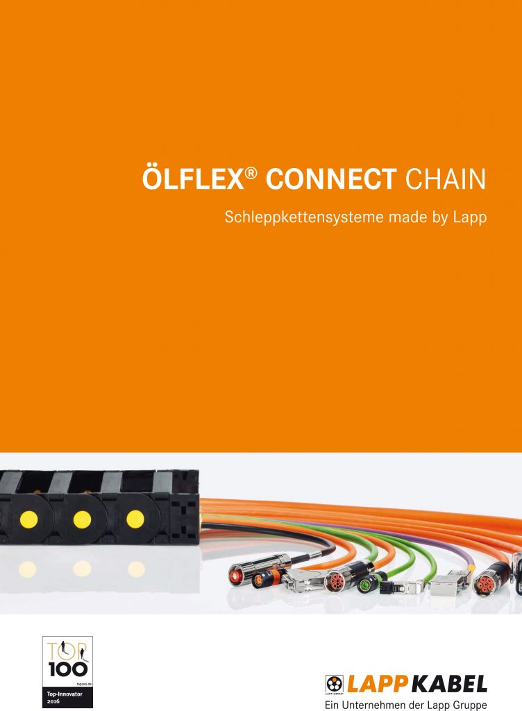 Um die Anwender bei der Konfiguration ihres individuellen Schleppkettensystems zu unterstützen, hat das Unternehmen Lapp auf der SPS IPC Drives 2016 erstmals den Ölflex Connect Chain-Katalog präsentiert. Der Katalog enthält auf über 350 Seiten Fachwissen über das Engineering von Energieketten, einen 40-seitigen technischen Leitfaden, ein Komplettangebot schleppkettentauglicher Markenkomponenten sowie das passende Serviceprogramm. Kunden finden im Katalog alle Lapp Komponenten wie Leitungen für Daten, Power und Signal sowie Stecker, Verschraubungen, Markierungen, und außerdem Servokonfektionen, die mit einem halbautomatischen Verfahren gefertigt werden. Außerdem enthält er das vollständige Schleppkettenportfolio aus Stahl und Nylon sowie Ketten für die Robotik. Damit folgt der Katalog der Lapp Philosophie „Die Kette ist für das Kabel da!“. Er kann kostenfrei von der Unternehmenswebseite heruntergeladen oder in papierform angefordert werden.