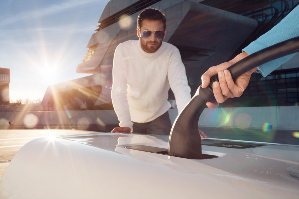 Das Rinspeed-Fahrzeug „Snap“ setzt auf HARTING Schnellladetechnik (rechts). – Bild: Harting KGaA