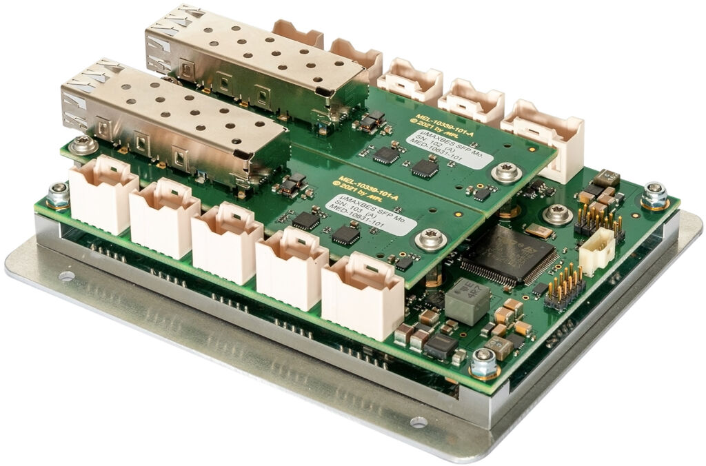Die neue µMaxbes-Lösung von MPL ist ein 10-Port-Open-Frame-Switch, der zwei 10GBit-Ports mit entweder Kupfer oder Glasfaser umfasst. Die Lösung ist kompakt und misst nur 115x95x34mm mit einem Gewicht von 237g (inkl. Kühlplatte und zwei SFP Carrier Boards). Der Managed Switch kann als Open-Frame-Lösung oder in einem MIL-Gehäuse mit Anschlüssen nach Wahl verwendet werden. Die Versorgungsspannung des Geräts beträgt 5V bis 36VDC und verbraucht im Vollbetrieb weniger als 6W. Der µMaxbes kann bei -20 bis +60°C betrieben werden. Die beiden 10GBit-Ports können mit SFP oder Copper (RJ45) bestückt und gemischt werden. Für die Glasfaserports können die meisten Ethernet-kompatiblen Transceiver (10GBit SFP+ und 1GBit SFP, gem. MSA) verwendet werden. Der Managed Switch wird mit einer Switch-Lookup Engine geliefert, die bis zu 1.024MAC Einträge mit automatischem Lernen und Altern unterstützt. Er bietet Zugriff auf verschiedene Einstellungen, um Funktionen wie Quality of Service, VLAN, Rapid Spanning Tree konfigurieren zu können. Die neue Lösung eignet sich unter anderem für alle robusten, industriellen und sicheren Netzwerkanwendungen in der Industrie, Verteidigung und Avionik sowie für Embedded-Systeme und -Lösungen.