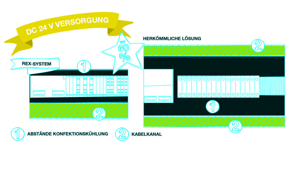 Durch die Verbindungstechnik können alle Absicherungs- und Stromverteilungsmodule sowie Buscontroller einfach, schnell und ohne weiteres Zubehör angereiht und gleichzeitig mechanisch wie auch elektrisch verbunden werden. Dadurch gestaltet sich die Installation des gesamten Systems intuitiv. Die Push-in-Anschlussklemmen verbessern außerdem die herkömmliche Verdrahtung außerhalb des Rex-Systems. Die kompakte Bauform der Schaltnetzteile spart laut Anbieter im Vergleich zu Marktbegleitern bis zu 35 Prozent an Volumen ein. In Kombination mit den übrigen Systemkomponenten fällt die Platzeinsparung noch größer aus. Anwender können im Gesamtsystem bis zu 60 Prozent des Flächenbedarfs einer 24VDC-Versorgung einsparen. Möglich wird das durch die geringen Abstände für die Konfektionskühlung der Schaltnetzteile sowie durch die bei allen Komponenten nach unten gerichteten Push-in-Anschlussklemmen. Die 12,5mm schmalen Absicherungsmodule vom Typ Rex12, Rex12D und Rex22D und die ebenfalls 12,5mm schmalen Potentialverteilungsmodule tragen auch zu einer größeren Platzersparnis bei.