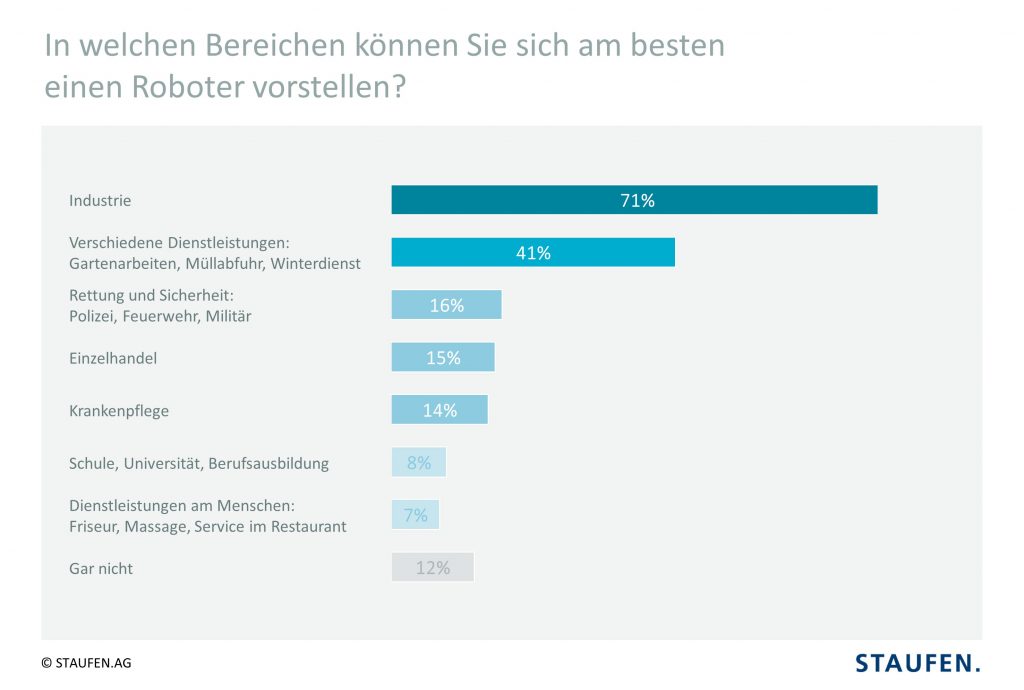 Groß, orange und hinter einem Schutzzaun – die Vorstellung der Deutschen von Robotern in der Arbeitswelt ist seit Jahren unverändert. Und so sehen nach wie vor 71% der Arbeitnehmer deren Einsatzgebiet vor allem in der Industrie, um gefährliche oder körperlich schwere Arbeiten zu verrichten. Roboter als Dienstleister oder Servicekräfte können sich hingegen nur 41% vorstellen, für Einsätze in der Krankenpflege reicht die Vorstellungskraft sogar nur bei 14%. Das sind Ergebnisse einer repräsentativen Umfrage der Unternehmensberatung Staufen unter mehr als 1.000 Arbeitnehmern in Deutschland. „Unsere Studie zeigt, dass bei der großen Mehrheit der Arbeitnehmer – und zwar aus allen Branchen – noch immer das Bild des Roboters als besserem Lastenkran oder unerschrockenem Laserschweißer vorherrscht“, sagt Dr. Jochen Schlick, Senior-Partner bei Staufen Digital Neonex. Das eher schlichte Bild von Robotern dürfte ein entscheidender Grund dafür sein, dass nur ein Drittel der Arbeitnehmer befürchtet, künftig in punkto Präzision und Fehlerfreiheit von einem Roboter übertrumpft zu werden, in der Industrie denken dass sogar nur ein Viertel der Beschäftigten. Fast drei Viertel der deutschen Arbeitnehmer wünschen sich von einem Roboter, dass er sie auf ihre Fehler aufmerksam macht. Ebenfalls schätzt die Mehrheit der Befagten die Berechenbarkeit und gleichmäßig hohe Qualität der Roboterarbeit.