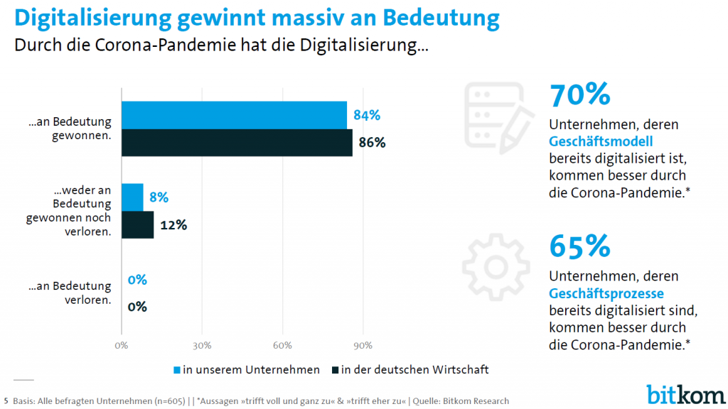 Zugleich wurde vielen Unternehmen auch die eigenen Defizite bei den bisherigen Digitalisierungsbemühungen vor Augen geführt. „Die Corona-Pandemie ist eindeutig ein Digitalisierungstreiber für die deutsche Wirtschaft“, sagte Bitkom-Präsident Achim Berg bei der Vorstellung der Studie. 84% der Unternehmen geben an, dass durch die Corona-Pandemie die Digitalisierung für das eigene Unternehmen an Bedeutung gewonnen hat. 86% sagen dies für die gesamte Wirtschaft. Zugleich glaubt keiner der Befragten, dass die Digitalisierung für das eigene Unternehmen oder die Wirtschaft durch die Pandemie an Bedeutung verloren hat. Ein Rekordwert von 97% sieht im November die Digitalisierung vor allem als Chance für das eigene Unternehmen, im April lag der Wert mit 90% noch deutlich darunter. Und 70% meinen, dass Unternehmen, deren Geschäftsmodell bereits digitalisiert ist, besser durch die Corona-Pandemie kommen. 54% geben an, dass ihnen digitale Technologien helfen, die Pandemie zu bewältigen. Jedes vierte Unternehmen sieht sich bei der Digitalisierung als Vorreiter. 71% der befragten Unternehmen räumen ein, zu den Nachzüglern zu gehören.