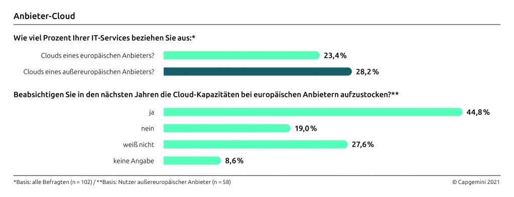 Fast 45% der Nutzer außereuropäischer Cloudanbieter wollen laut einer Capgemini-Studie ihre Cloudkapazität in Europa erweitern. Die Strategie wird dabei von Bedenken in Bezug auf Datenschutz und Datensouveränität beeinflusst. Außereuropäische Cloudanbieter stellen derzeit rund 28% der cloudbasierten IT-Services bereit, die von Unternehmen und Behörden in Deutschland, Österreich und der Schweiz genutzt werden. Demgegenüber werden etwa 23% bei europäischen Providern eingekauft, so die Studie. Die Nutzung intelligenter Technologien ist in den letzten 12 Monaten leicht gestiegen, liegt bei den großen Unternehmen allerdings etwas unter Vorjahresniveau, so die Studie. Es sind hauptsächlich Anwender aus den mittelgroßen Unternehmen mit bis zu einer Milliarde Euro Umsatz, die ihre Aktivitäten im vergangenen Jahr ausgebaut haben. Etwa 8% von ihnen nutzen intelligente Technologien jetzt intensiv oder sehr intensiv. Diese Quote ist im Vergleich zu den Top50- und den Top100-Unternehmen mit rund 24% jedoch immer noch gering. Die befragten CIOs priorisieren die Einsatzbereiche intelligenter Technologien in der aktuellen Studie ähnlich wie im Vorjahr: An der Spitze stehen einfache Einsatzszenarien wie die Automatisierung manueller Arbeiten. Laut Studie werden diese offenbar auch von den Anwendern positiver bewertet als komplexe Lösungen wie beispielsweise Empfehlungssysteme oder die Vorhersage des Verhaltens von Maschinen, Kunden oder Märkten. Den Einsatz intelligenter Technologien im eigenen Unternehmen halten die Befragten – wie im Vorjahr – für weniger erfolgreich als bei ihren Kollegen. Da deren Euphorie etwas abgenommen hat, liegen ihre Einschätzungen in der aktuellen Studie näher beieinander.