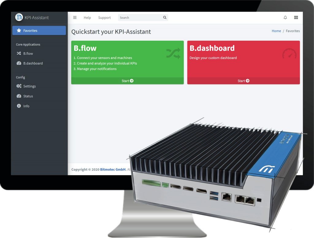 Der KPI-Assistant vereinfacht die Integration für beliebige Prozessanalysen. Dazu stehen herstellerunabhängige Schnittstellen zu Maschinen und einer Vielzahl an Sensoren zur Verfügung (z.B. OPC UA Client/Server, MQTT Client/Broker, IO-Link). Zudem wird ab Q1/21 eine GigE-Vision-Schnittstelle für den Anschluss von industriellen Kameras bereitgestellt. Auch für die Anbindung an IT-Netzwerke mittels Ethernet, WLAN, LoRaWAN oder 5G stehen die benötigten Technologien bereits zur Verfügung. Für die Konfiguration der Datenverarbeitung ist ein erweitertes Node-RED (B.flow) integriert. Das ermöglicht es, die Rohdaten aus diversen Quellen zu sammeln, zu analysieren und weiterzuleiten. So können beispielsweise Ergebnisse aus Bildverarbeitungsanwendungen oder intelligenten Industriekameras mit zusätzlichen Sensorwerten aus der Produktionsanlage kombiniert und weiterverarbeitet werden. Zusätzlich können eigene Funktionalitäten und Analysen individuell mittels Javascript-Funktionsblöcken im B.flow selbst implementiert werden. Erweiterungen um Third-Party-Applikationen sind bei Bedarf möglich. Auch komplexere KI-Anwendungen können on-the-edge trainiert und ausgeführt werden.