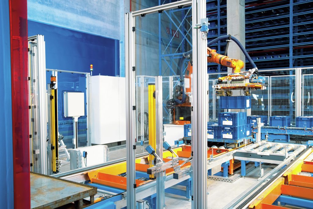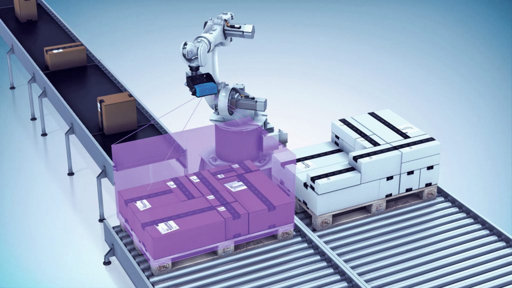 Zentrales Element der Depalettierungslösung ist ein Knickarmroboter, der mit dem 3D-Vision-Sensor Visionary-T von Sick ausgestattet ist. – Bild: Sick AG