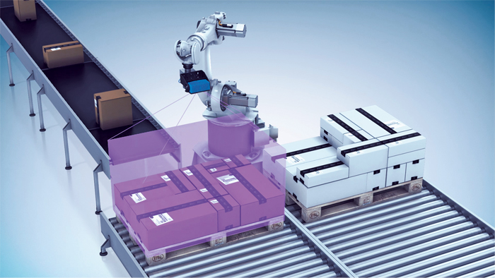 Gelöst wurde diese Aufgabe mit dem 3D-Snapshot-Sensor Visionary-T. Die Streaming-Kamera versorgt die Robotersteuerung mit Messwerten zu Form, Ausrichtung und Abstand von Objekten auf der Palette. Der Sensor ermittelt Abstands- und Größeninformationen von Objekten durch 3D-Lichtlaufzeitmessung (Time-of-Flight, ToF). Hierfür sendet der Sensor Infrarotlicht aus, welches an den Objekten in der Umgebung reflektiert wird. Aus der Phasenverschiebung zwischen Licht und Lichtremission berechnet der Sensor die Distanz zur Palettenoberfläche, d.h. zu den einzelnen Kartons oder Kisten, und stellt diese in einer 3D-Punktwolke dar. Die Algorithmen von Neadvance nutzen die 3D-Bildinformationen, um für jedes einzelne Pixel Tiefen- und Intensitätsinformationen zu generieren und so die Form, Ebene und Ausrichtung von Kisten und Karton zu bestimmen. Dies ermöglicht es der Robotersteuerung zu erkennen, welcher Behälter als nächstes kollisionsfrei angefahren und am besten gegriffen werden kann und die entsprechenden Zielkoordinaten für die automatische Bahnführung des Roboters zu berechnen.