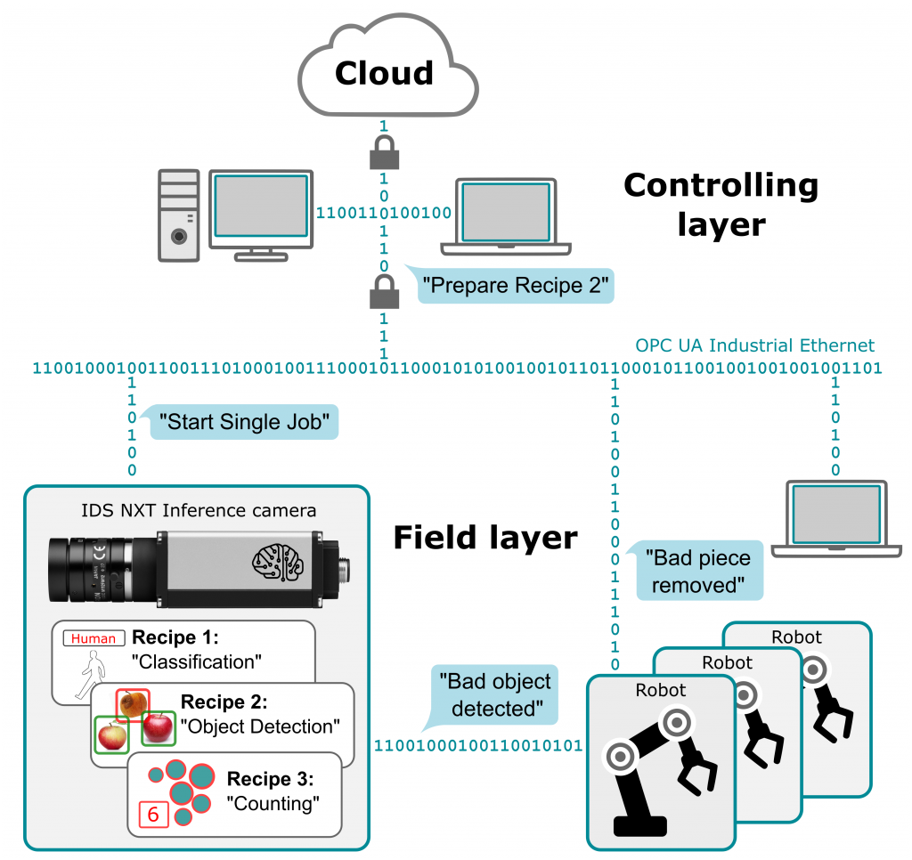OPC UA ist eine Schlüsseltechnologie, um Daten und Information in der Industrie auszutauschen. Das Industrieprotokoll etabliert sich durch Eigenschaften wie Plattformunabhängigkeit, Skalierbarkeit und Kommunikationssicherheit immer weiter als offener Standard. OPC UA ist aber keine alleingültige Schnittstelle, die alle anderen Interfaces ablösen soll. Es ist ein IT-Standard, der es geschafft hat, die gesamte Fabrik zu durchdringen und zu verbinden. Der einheitliche Austausch über alle physikalischen Layer und Ethernet-basierten Feldbusse hinweg bis in die Cloud bringt eine enorme Vereinfachung des Engineering-Aufwands, wenn Daten nicht über verschiedene Protokolle gelesen, konvertiert und synchronisiert werden müssen. OPC UA vereinheitlicht dazu die Sprache der Geräte untereinander und legt fest, wie sich Geräte gegenüber Clients selbst beschreiben und wie sie gesteuert werden. Eine ähnliche Bekanntmachung der Gerätefähigkeiten ermöglicht bereits der generische Schnittstellenstandard GenICam. Dieser vereinheitlicht den softwarebasierten Zugriff auf Kamera-Features jeglicher Art und Hersteller. OPC UA verwendet sogenannte Companion Spezifikationen, welche die wichtigsten Informationen festlegen, um Geräte einer bestimmten Branche umfassend zu beschreiben und somit quasi als Wörterbuch dienen. Komplexe Bildverarbeitungsaufgaben der Geräte werden durch OPC UA in Funktionsbausteinen (Rezepten) gekapselt, deren genaue Wirkungsweise dem Automatisierer bzw. Anwender nicht bekannt sein müssen. Ebenso werden alle notwendigen Einstellungen in Konfigurationsdatensätzen gespeichert und verwaltet. Indem proprietäre Elemente durch herstellerunabhängige Informationsstrukturen ersetzt werden, entsteht ein standardisierter Informationsaustausch zwischen Bildverarbeitungssystemen, Machinen- und Anlagensteuerung oder einem Softwaresystem wie MES, Scada oder ERP.