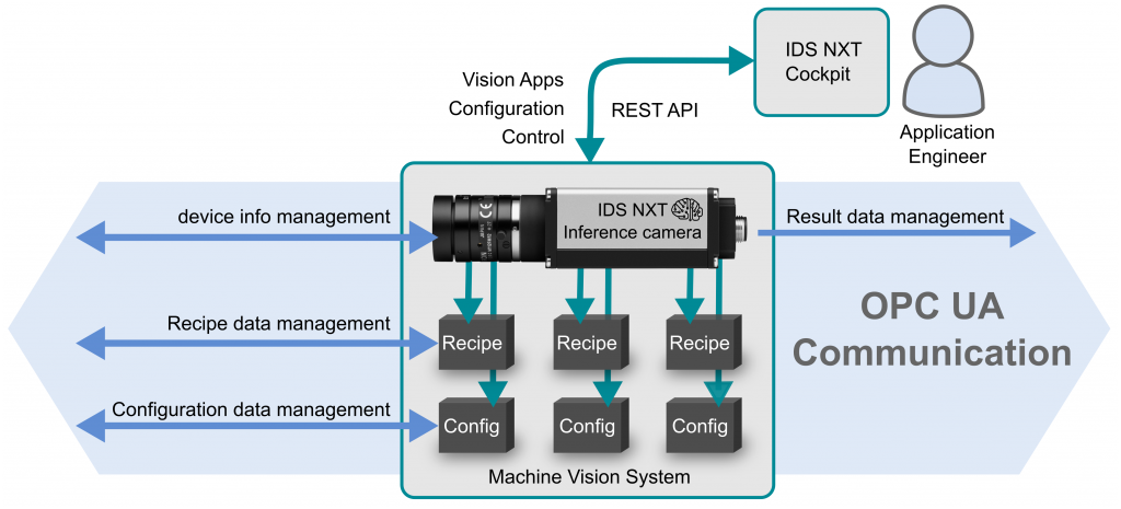 Mit einem REST-Webservice (Representational State Transfer) bieten die Kameras eine standardisierte, plattformunabhängige Schnittstelle, die eine einfache Vernetzung mit anderen webfähigen Geräteklassen ohne zusätzliche Software oder Gateways basierend auf dem HTTP-Protokoll erlaubt. Zusätzlich bleibt er die maßgebliche Schnittstelle, wenn es darum geht, die Inferenzaufgaben mit den zugehörigen Einstellungen einzurichten und sie per Rezepte und Konfigurationen in der OPC-Welt bereit zu stellen. Denn für diese geräte- und herstellerspezifischen Prozesse stellt die OPC-UA-Spezifikation selbst keine einheitlichen Funktionsaufrufe zur Verfügung. Bildverarbeitungssysteme sind kaum vergleichbar was ihre Steuerung, Arbeitsweise und die verwendeten Einstellungen und Daten angeht. Daraus lässt sich nur schwierig ein Standard schaffen, ohne die sehr individuellen Systeme in ihrer Funktionalität zu stark zu beschränken bzw. eine generische Schnittstelle zu stark aufzublähen. Damit bleiben Alleinstellungsmerkmale für die Gerätehersteller weiterhin möglich und die OPC-UA-Kommunikation schlank und skalierbar. OPC UA wird die Geräteschnittstellen also nicht ersetzen, sondern ergänzt die Möglichkeiten im Industrieumfeld. Kamerakonfigurationen und Vision-App-basierte Inferenzaufgaben werden dazu in einem für OPC-UA-kompatiblen und lesbaren Format abgespeichert.
