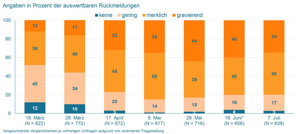 So lautet die Kernbotschaft der 7. VDMA-Blitzumfrage Anfang Juli zu den wirtschaftlichen Auswirkungen der Corona-Pandemie, an der 640 Mitgliedsunternehmen teilnahmen. „60 Prozent unserer Mitglieder rechnen damit, 2021 nominale Umsatzsteigerungen zu erzielen. Diejenigen Unternehmen, die für 2020 nur geringe Umsatzeinbußen oder sogar Umsatzsteigerungen erwarten, sind auch für 2021 optimistischer“, analysiert VDMA-Volkswirt Dr. Ralph Wiechers. Bis das Umsatzniveau von 2019 wieder erreicht sein wird, ist es aber noch ein langer Weg. „Zwar gibt es bei zahlreichen Frühindikatoren erste Anzeichen für eine Aufhellung. Doch dieser Optimismus ist erwartungsgetrieben und daher sehr fragil“, warnt Wiechers. Zu berücksichtigen ist außerdem, dass über die Hälfte der Unternehmen für 2020 Umsatzeinbußen von 10 bis 30 Prozent erwartet. Die Basis für ein Wachstum im Folgejahr ist daher entsprechend niedrig.
