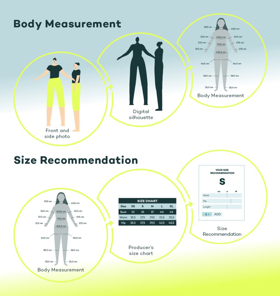 Auch Sizeez basiert auf einer KI. Zunächst erzeugt die Software aus den beiden Körperbildern Silhouetten. Die Originalbilder, auf denen die Kunden eventuell zu erkennen sind, werden anschließend aus Datenschutzgründen sofort gelöscht. Im nächsten Schritt ermittelt die KI aus den Silhouetten verschiedene Körpermaße. Grundlage dieser Maße sind die in der ISO 8559 definierten anthropometrischen Definitionen der Vermessung eines Körpers. Die App Size Recommendation vergleicht diese Daten mit den Größentabellen der Hersteller und gibt eine passende Größenempfehlung ab. Um das neuronale Netz zu trainieren hat Virtual Retail passende Rohdaten erworben. Darin sind Personen in den beiden oben beschriebenen Positionen fotografiert, und die exakten Körpermaße wurden zusätzlich mit einem 3D-Scanner aufgenommen. Nach dem Abschluss des Trainings kann die KI die geforderten Körpermaße mit einer sehr hohen Genauigkeit aus den Silhouetten ermitteln.