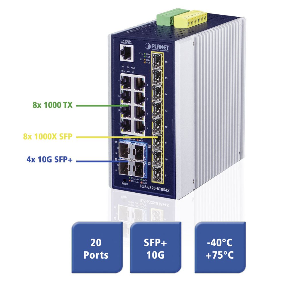 Der voll administrierbare 20-Port-Ethernet-Switch IGS-6325-8T8S4X von Spectra eignet sich für Netzwerke mit schnellem Datentransfer und großen Datenmengen. Er stellt vier 10G-SFP+- und 16 GBit-Ethernet-Ports bereit, von denen jeweils acht als RJ45- und SFP-Ports ausgeführt sind. Über die SFP-Ports sind Verbindungen bis 2km im Multi Mode oder längere Backbone-Verbindungen bis 120km im Single Mode möglich.