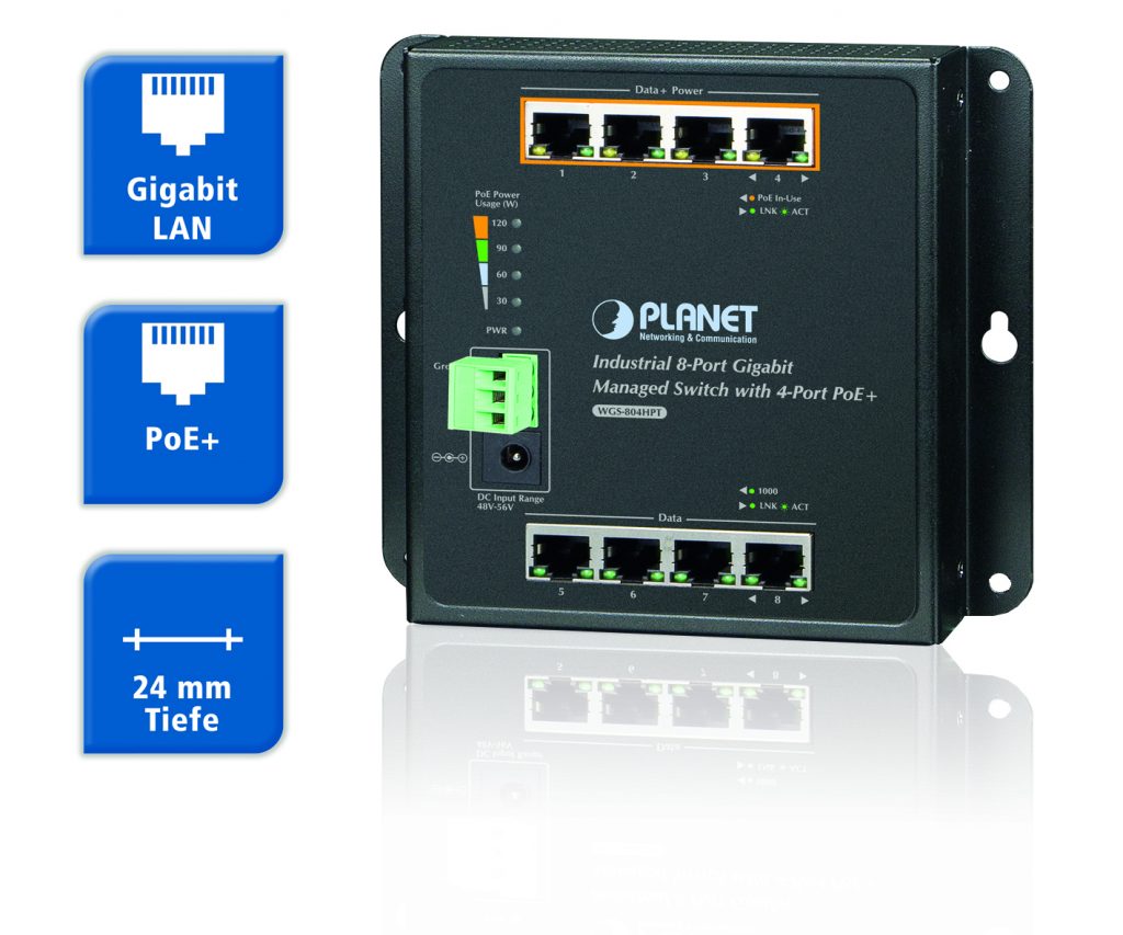 Der PoE+ Gigabit Switch WGS-804 von Spectra eignet sich für Schaltschränke oder Klemmenkästen, in denen nur geringer Platz vorhanden ist. Alle Anschlüsse sind nach vorn ausgeführt. Der administrierbare Switch verfügt über acht Gigabit-Ports. Vier davon sind als PoE+ Ports ausgeführt, an denen bis 36W Leistung pro Port zur Verfügung stehen. Dort lassen sich z.B. Industriekameras mit Schwenk-, Neige- und Zoom-Funktion, Wireless-Access-Points oder auch Thin-Client-Rechner anschließen.