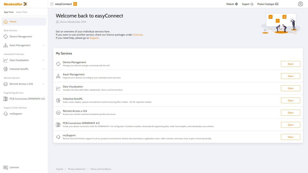 Als Anbieter von Lösungen für die elektrische Verbindungstechnik, Automatisierung und Industrial IoT setzt Weidmüller auf digitale Entwicklungen, die Mehrwerte für Kunden schaffen. Hierbei spielt EasyConnect eine zentrale Rolle als Industrial Service Platform und zentraler Touchpoint für alle digitalen Dienste. Mit diesem ganzheitlich konzipierten System verfolgt Weidmüller die Vision, seinen Kunden entlang aller Phasen des Produktlebenszyklus – von der Planung über die Installation bis in den Betrieb – Mehrwerte rund um die verschiedenen Weidmüller-Produkte bereitzustellen. Durch die Verknüpfung bisher nicht verbundener Services entstehen zudem Synergien, die zu Effizienz- und Produktivitätssteigerung beitragen. Es handelt sich damit um eine umfassende Lösung, die weit über die Funktionen herkömmlicher IIoT-Plattformen hinausgeht.