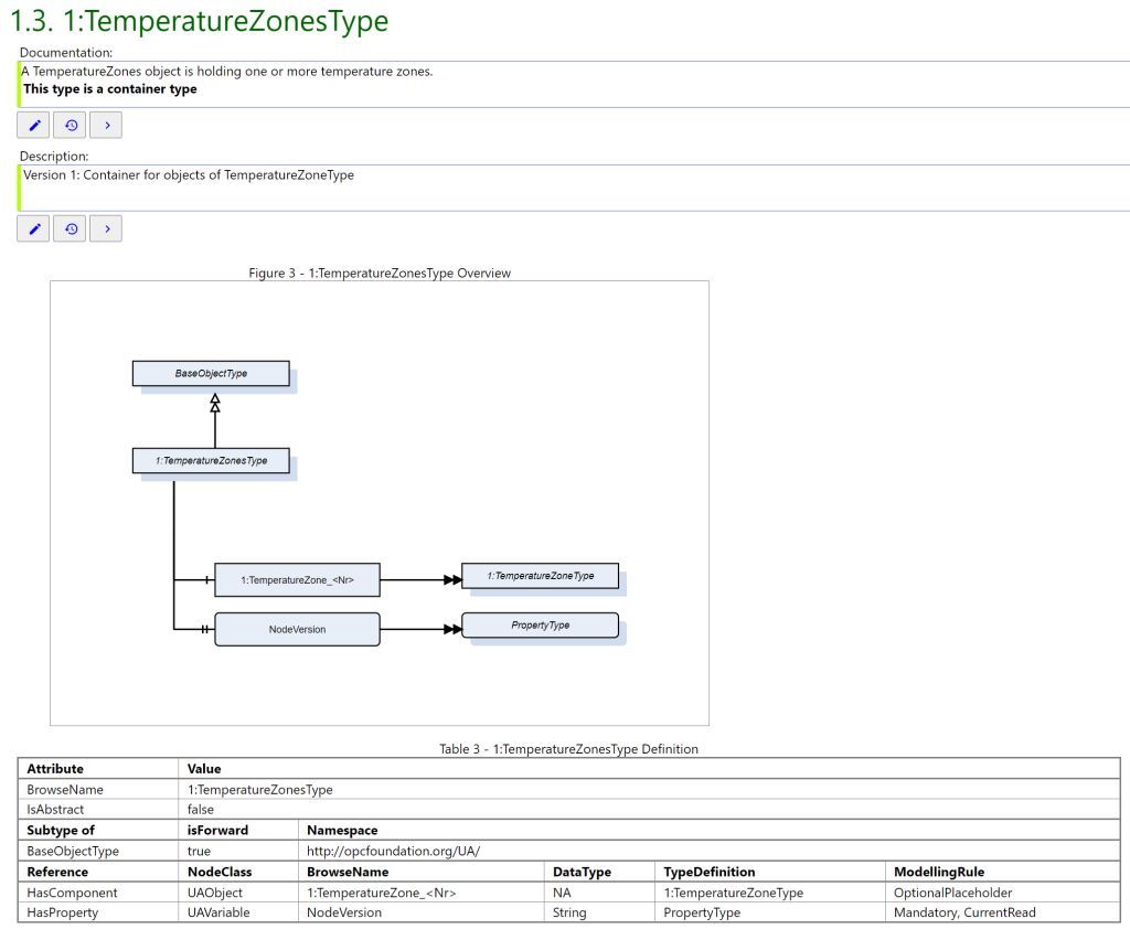 Die Generierung einer Dokumentation orientiert sich an der von der OPC Foundation propagierten Darstellung von „UA Companion Specifications“ mit Tabellen und Diagrammen. NodeDoc erlaubt auch die Verwaltung verschiedener Versionen von Informationsmodellen. Über eine Vergleichsfunktion können Unterschiede zwischen Versionen dargestellt werden, was eine Nachvollziehbarkeit der Evolution eines Informationsmodells erlaubt.