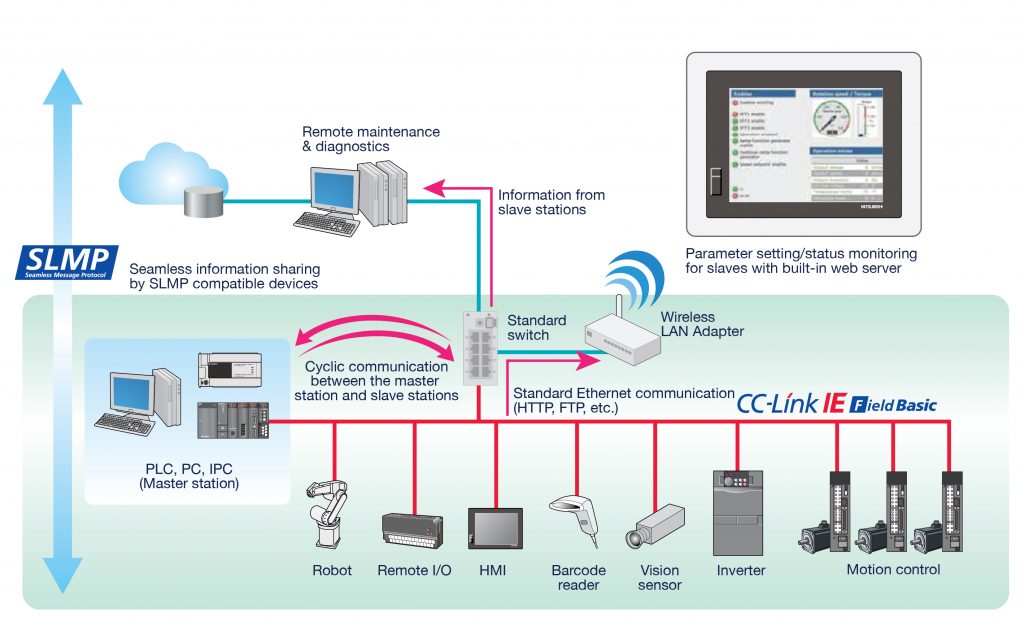 CC-Link IE Field Network Basic (oder „Basic Mode“) ermöglicht es Geräteanbietern, jedes Produkt mit 100-Mbit-Ethernet-Buchse ganz einfach mit CC-Link-IE-Kompatibilität auszustatten. –