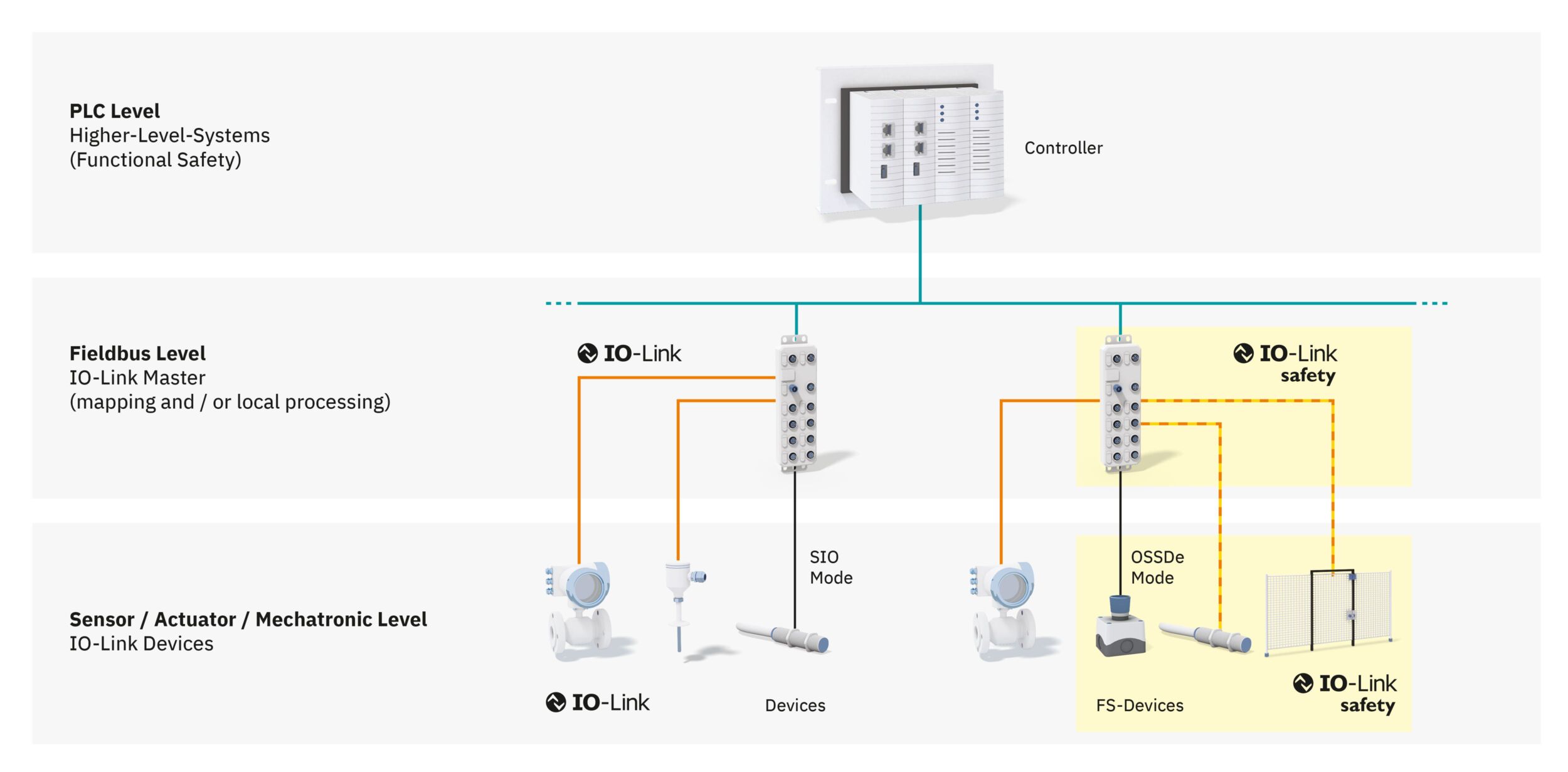 In einem üblichen Automatisierungssystem mit IO-Link ist die Auswerteeinheit zum Beispiel in Form einer Steuerung eingesetzt. Die Einheit verarbeitet die Signale und Daten von IO-Link-Sensoren und -Aktoren. Im Kontext von IO-Link Safety kommen die Aspekte der funktionalen Sicherheit hinzu, weshalb eine Sicherheitssteuerung unausweichlich ist. Durch die Verwendung eines sicheren Feldbusses, wie beispielsweise Profinet/Profisafe oder Ethercat/FSoE, können IO-Link-Safety-Master mit der Steuerungseinheit sichere Prozessdaten austauschen. Dabei führt der IO-Link-Safety-Master eine Gateway-Funktion aus und stellt somit die Schnittstelle zu den IO-Link-Safety-Devices her.