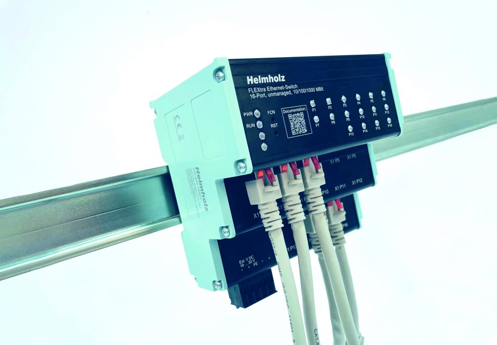 Der Flextra Ethernet Switch für bis zu 1.000Mbit ergänzt das Portfolio von Helmholz. Seine Stufenbauweise und die damit verbundene vertikale Kabelführung ermöglicht eine flexible und platzsparende Installation. Mit 16 RJ45-Ports und einer kompakten Bauweise ist er für vielfältige Industrieanwendungen einsetzbar. Die Ethernet-Anschlussleitungen werden direkt vom Switch in den Kabelkanal geführt und lassen sich so auch in kleinen Schaltschränken und Unterverteilern leicht einsetzen. Weiter bietet er einen werkzeuglosen Push-In-Anschluss für die Spannungsversorgung und eine übersichtliche LED-Anzeige auf der Vorderseite für klare Statusinformationen. Der Unmanaged-Ethernet-Switch entspricht Profinet Conformance Class A.