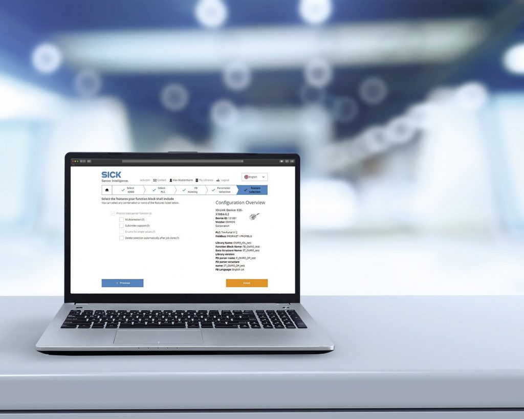 Die herstellerübergreifende Integration von IO-Link-Sensoren ist oft eine Herausforderung. Der Webservice Function Block Factory (FBF) von Sick erstellt aus einer IO Device Description einen individuellen SPS-Funktionsbaustein, unabhängig von Gerätetyp und Hersteller. So können Geräteparameter auf einfache Art und Weise gelesen und geschrieben werden. Die FBF unterstützt die meisten SPS-Systeme. Funktionsbausteine erleichtern das Lesen und Schreiben der Geräteparameter. Zudem können sie individuell gestaltet werden – das gilt sowohl für die Auswahl der SPS als auch für die Auswahl und Benennung der unterstützten IO-Link-Geräteparameter und -features. Auch Prozessdaten-Parserfunktionen lassen sich generieren. Sie erleichtern und beschleunigen die SPS-Programmierung und tragen zur Fehlervermeidung bei.