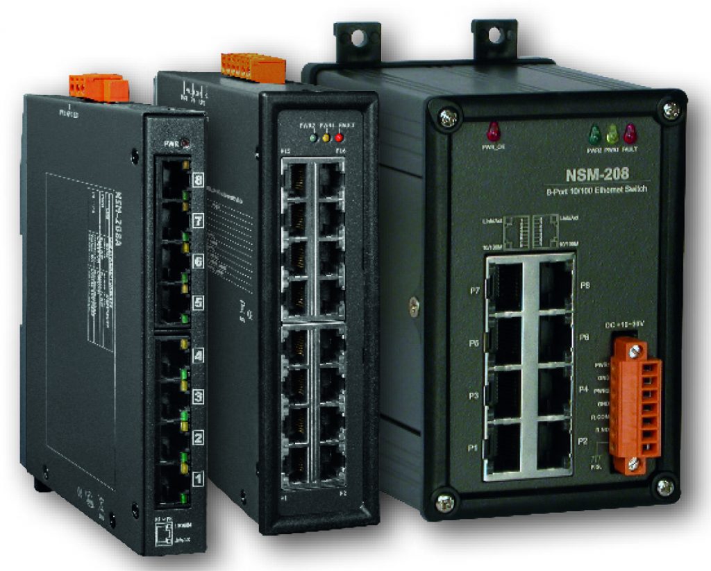 Für den Aufbau eines Ethernet-Netzwerkes im industriellen Umfeld bietet ICPDAS ein Produktportfolio für Ethernet Switche. Fünf bis 16 Ethernet Ports mit Übertragungsraten von 10 bis 1.000Mbit/s stehen zur Auswahl. Die Switche unterstützen die Autonegotiation und Auto-MDI/MDI-X-Funktionen. Die Datenübertragung realisieren die Geräte durch Store and Forward mit entsprechendem Speicherpuffer. Der Eingangsspannungsbereich von +10 bis +55VDC und Geräte mit PoE sorgen für Flexibilität. Mit dem Temperaturbereich von -40 bis +75°C und robusten Metall- oder Kunststoffgehäusen eignen sich die Switche für die Hutschienenmontage im rauen industriellen Umfeld. Fehlermeldungen und der Betriebszustand werden direkt über LEDs am Gerät angezeigt. Der redundante Spannungseingang hält die Geräte auch bei Ausfall einer Stromversorgung online. Gemeinsam mit der Alarmfunktion wird so eine hohe Betriebssicherheit erreicht.
