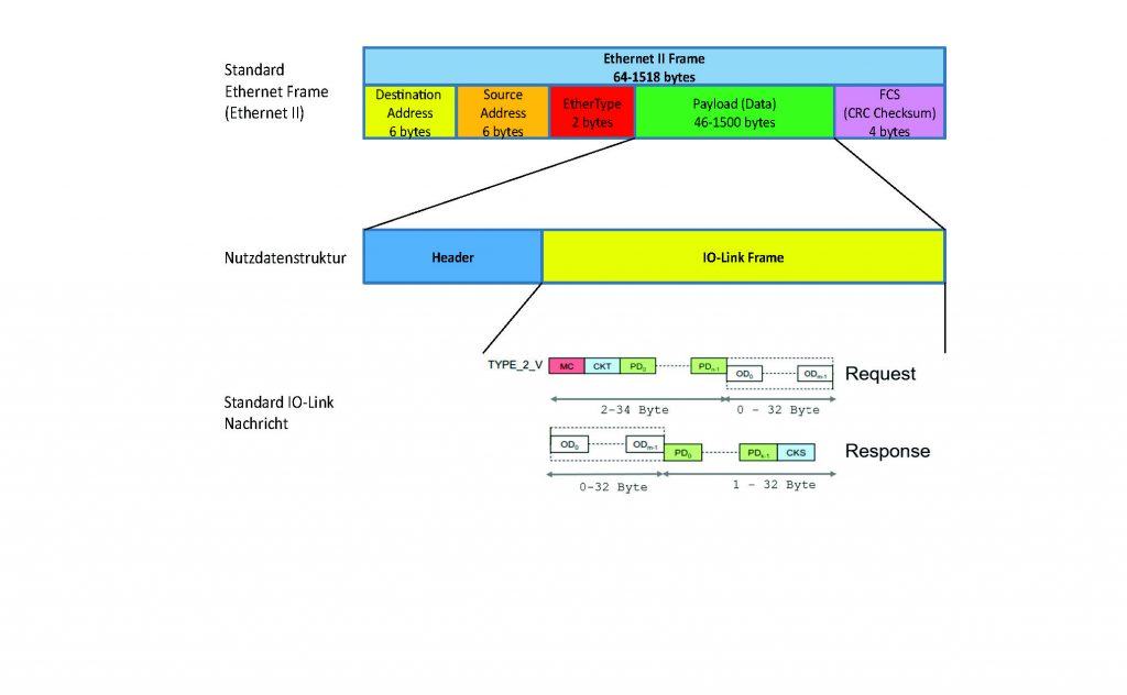 Warum also nicht das bestehende System IO-Link beibehalten und um eine weitere physikalische Schnittstelle erweitern? Genau dies ist der Ansatz des Konzepts für IO-Link-over-SPE. Anstatt die IO-Link-Nachrichten als pulscodierte Telegramme über das klassische Dreileiterkabel mit 24V-Pegel zu übertragen, werden die IO-Link-Nachrichten in Ethernet-Frames verpackt und über einen SPE-Treiber über eine Twisted-Pair Leitung übertragen – ohne TCP-IP oder UDP. Die Kernkomponenten der IO-Link Kommunikation, die Implementierungen der Protokoll-Layer und die Funktionalität bleiben unverändert. Genauso wie die Integration in überlagerte System. Lediglich das Kommunikationsmedium wird ausgetauscht. Bild 3 zeigt die Einbettung der IO-Link-Nachrichtenstruktur in einen Ethernet Frame. Dies bedeutet, dass für IO-Link eine spezifische Nutzdatenstruktur erforderlich ist, die durch einen EtherType im Ethernet Frame gekennzeichnet ist. Folglich ist für die gezeigte IO-Link-spezifische Abbildung ein eigener EtherType erforderlich. In jedem Ethernet Frame, bzw. in den Nutzdaten findet eine komplette IO-Link-Nachricht Platz. Sie ist meist sogar deutlich kürzer als die minimal mögliche Nutzdatenlänge des Ethernet Frames, d.h. es werden mehr Daten übertragen als erforderlich. Die resultierende Zykluszeit für den Austausch von Ethernet Frames und damit auch der IO-Link-Nachrichten ist aufgrund der Übertragungsrate von 10MBit/s trotzdem deutlich kürzer als bei Standard-IO-Link. Über den gezeigten Header sind zukünftige Erweiterungen oder Änderungen des Protokolls möglich. Die Methodik, die bestehende Nachrichtenstruktur von IO-Link unverändert in einen Ethernet Frame einzubetten, ist die zentrale Idee hinter IO-Link-over-SPE. Diese Vorgehensweise ist gleichzeitig der Schlüssel, für die einfache Migration auf SPE (IO-Link-over-SPE) und die Wiederverwendbarkeit der Implementierungen und Tools.
