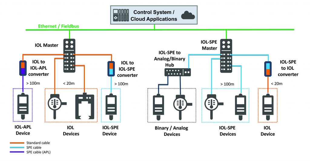 Der Fall, dass in einem System mit IO-Link-Standard Komponenten ein einzelnes Endgerät in einer Umgebung mit Anforderungen zum Explosionsschutz eingesetzt werden soll, kann mit einem IO-Link nach IO-Link- APL Konverter abgedeckt werden. Die Grundstruktur zwischen IO-Link Master und Endgeräten in der eigensicheren Umgebung ist identisch zu der bekannten Struktur im Umfeld mit Standard-IO-Link. Als Schnittstellenphysik kommt SPE in der Ausprägung APL (Advanced Physical Layer) zum Einsatz. Die Distanz zwischen Master und Endgerät ist damit auf maximal 200m begrenzt. Im IO-Link-APL Master sind dann entsprechende Maßnahmen zu ergreifen, um die eigensichere Abtrennung der Versorgung und Kommunikation zum überlagerten System zu gewährleisten. Auch für die eigensichere Anwendung ist ein Ansatz denkbar, bei dem über einen Hub analoge oder binäre Signale von eigensicheren Endgeräten erfasst und gesammelt über IO-Link-APL zum Master übertragen werden.