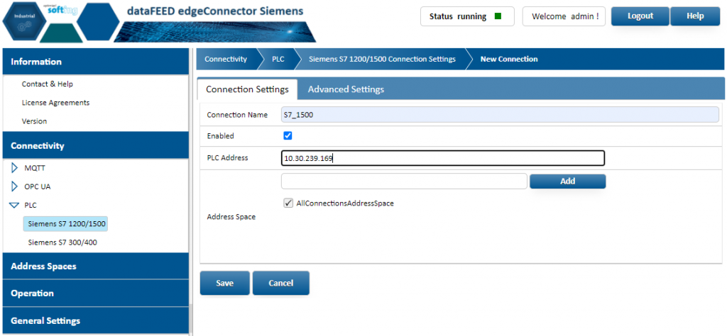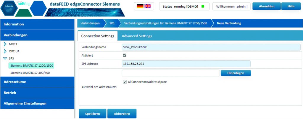 EdgeConnector Siemens unterstützt den direkten Zugriff auf die Siemens-Steuerungen Simatic S7-300/400 sowie Simatic S7-1200/1500. Die Datenbausteine und deren Inhalt können über das Standard S7-Protokoll direkt adressiert und ausgelesen werden. Durch das ebenfalls unterstützte neue S7-Protokoll der Steuerungen Simatic S7-1200/1500 ist der Zugriff auf die optimierten Bausteine möglich. Die Konfiguration des Namensraums wird durch den Import von Simatic-Step7- oder TIA-Portal-Projektdateien erleichtert. Darüber hinaus können auch Simatic-S7-1200/1500-Variablen durch Browsen hinzugefügt werden. EdgeConnector Siemens kommt insbesondere für die Betriebsdatenerfassung, die Analyse von Fertigungsparametern oder die vorausschauende Wartung zum Einsatz.