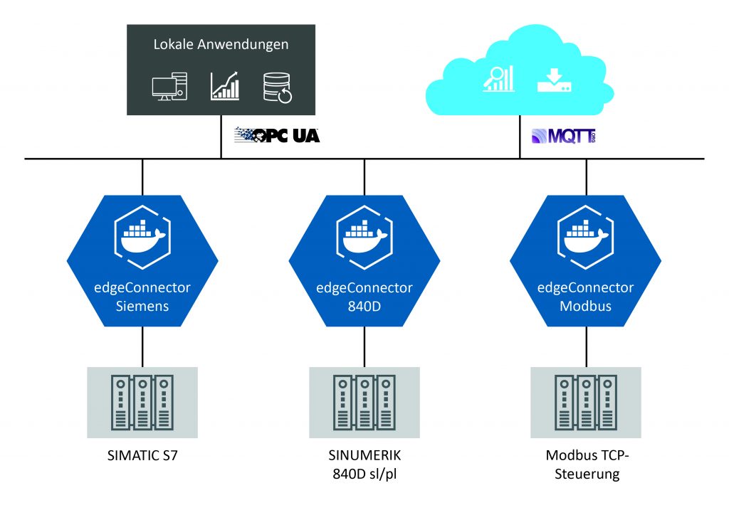 EdgeConnector 840D ist kompatibel mit den CNC-Steuerungen Sinumerik 840D Solution Line und (über einen Ethernet-Protokollwandler) Sinumerik 840D Power Line. Damit lassen sich sämtliche Prozessparameter aus dem NC-Teil (Achs-, Werkzeug- und Programmdaten/-abschnitte sowie Alarme) wie auch dem SPS-Teil (Zustände, Ein- und Ausgangssignale, Daten aus Datenbausteinen und Alarme) auslesen. Darüber hinaus stehen ebenfalls die Antriebsdaten (Drehmomente, Ströme, Drehzahlen) zur Verfügung. Für die Konfiguration des Namensraums unterstützt EdgeConnector 840D den Import einer Simatic-Step7- oder TIA-Portal-Projektdatei oder das Einlesen von AWL-Dateien. Mit einer Container-Anwendung lassen sich bis zu fünf Werkzeugmaschinen einbinden. Typische Anwendungsfälle sind die Überprüfung der Fertigungsqualität und -toleranzen, die Maschinendatenerfassung, die Überwachung von Spindeln und Werkzeugen, die Datenintegration in übergeordnete Managementsysteme oder die Visualisierung von Prozessparametern und anderen Leistungsindikatoren.