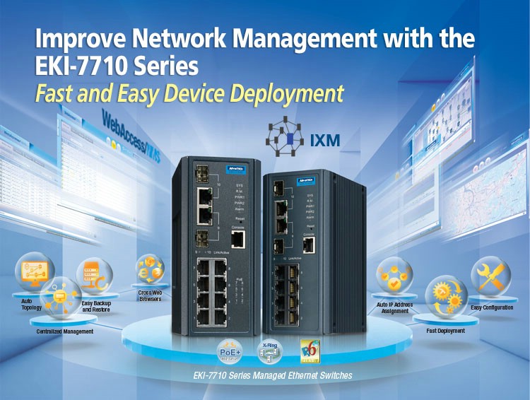 Die IXM-Technik von Advantech auf den Managed Switches EKI-5500 und EKI-7700 von AMC ist eine neue Lösung für die schnelle Netzwerk- und Konfigurationsbereitstellung. Sie bietet eine Cross-Management- und schnelle Bereitstellungsfunktion, mit der Switches ihre Firmware aktualisieren und die Konfiguration effizienter wiederherstellen können. Anwender, die einen einzelnen gemanagten Switch der Serie EKI-7700 besitzen, können sowohl die EKI-7700- als auch die EKI-5000-ProView-Switches verwalten. Um eine schnelle Netzwerkbereitstellung zu ermöglichen, unterstützt IXM sowohl Massen-Firmware-Upgrades als auch eine flexible Konfigurationswiederherstellung über eine Web-GUI. Die EKI-7700-Switches verfügen über eine Jumbo-Frame-Funktion, die Pakete bis zu 9.216 Bytes unterstützt. Die Switches eignen sich dadurch u.a. für den Einsatz in der Videoüberwachung.