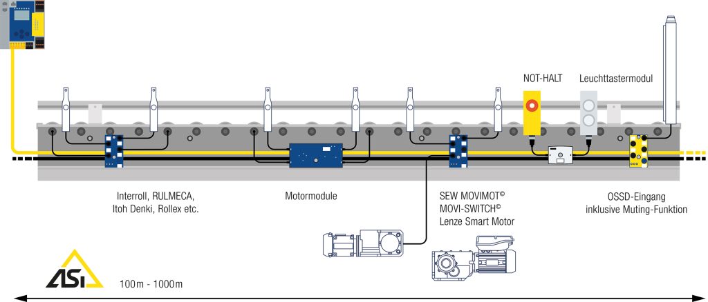 Die wichtigen Informationen des ASi Netzwerks – Prozessdaten und Diagnosen – stehen durch den im Gateway integrierten OPC UA Server auch für Industrie-4.0-Anwendungen zur Verfügung. Zudem können zyklisch wichtige Kenngrößen, wie die Spannungsversorgung und der Motorstrom, übermittelt werden. In der Praxis werden Motormodule zwar oft in reinen ASi-3- oder ASi-5-Applikationen eingesetzt, oft machen gemischte Installationen aber durchaus Sinn – etwa dann, wenn eine einfache Signalleuchte mit ASi-3 angesteuert wird, der Umrichter aber mit ASi-5.