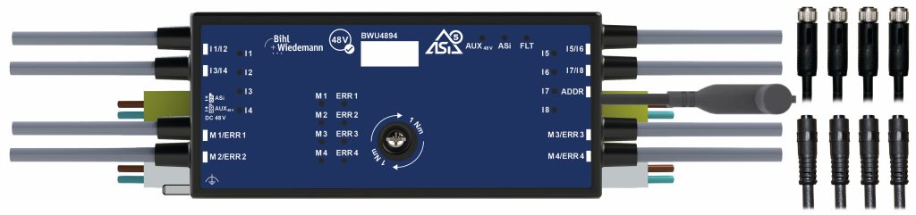 Die ASi-5-Kabelkanal-Motormodule BWU4893 und BWU4894 für 24- bzw. 48V-Motorrollen machen den Anschluss zahlreicher Rollenantriebe in einer Applikation jetzt noch flexibler und kostengünstiger. Die Bauform und die Abmessungen der Gehäuse sowie die integrierten Kabel für Sensoren und Motoren erleichtern die Montage im Kabelkanal entlang der Materialflussstrecke. An jedem Modul können bis zu vier Motorrollen und bis zu acht Sensoren angeschlossen und versorgt werden. Jede der vier Motorrollen kann man dabei individuell und flexibel ansteuern – unter einer einzigen ASi-5-Teilnehmernummer (ASi-Adresse). Verschiedene Status-LEDs unterstützen bei der Inbetriebnahme und ermöglichen im Betrieb eine einfache Diagnose der Eingänge. Der mit -30 bis +70°C spezifizierte Temperaturbereich ermöglicht den Einsatz der IP54-geschützten Module sowohl in Kühl- und Tiefkühlumgebungen als auch in Förderanlagen mit höheren Umgebungstemperaturen. Bei diesen Modulen besteht die Möglichkeit, Geschwindigkeit sowie Start- und Stopprampen mit Zykluszeiten bis 1,27ms stufenlos schreiben zu können. Außerdem kann jedes neue ASi-5-Kabelkanalmodul bis zu vier ZPA-Zonen autark realisieren. Dies erfolgt komfortabel mit Hilfe der PC-Software von Bihl+Wiedemann, ohne übergeordnete Steuerung sowie damit verbundenen Programmieraufwand und unabhängig von der in der Anlage verwendeten Antriebslösung. Zusammen mit den ebenfalls verfügbaren ASi-5-Kabelkanalmodulen für zwei Motoren lässt sich so die Zahl ungenutzter Motoranschlüsse verringern und Anschlusskosten sparen.