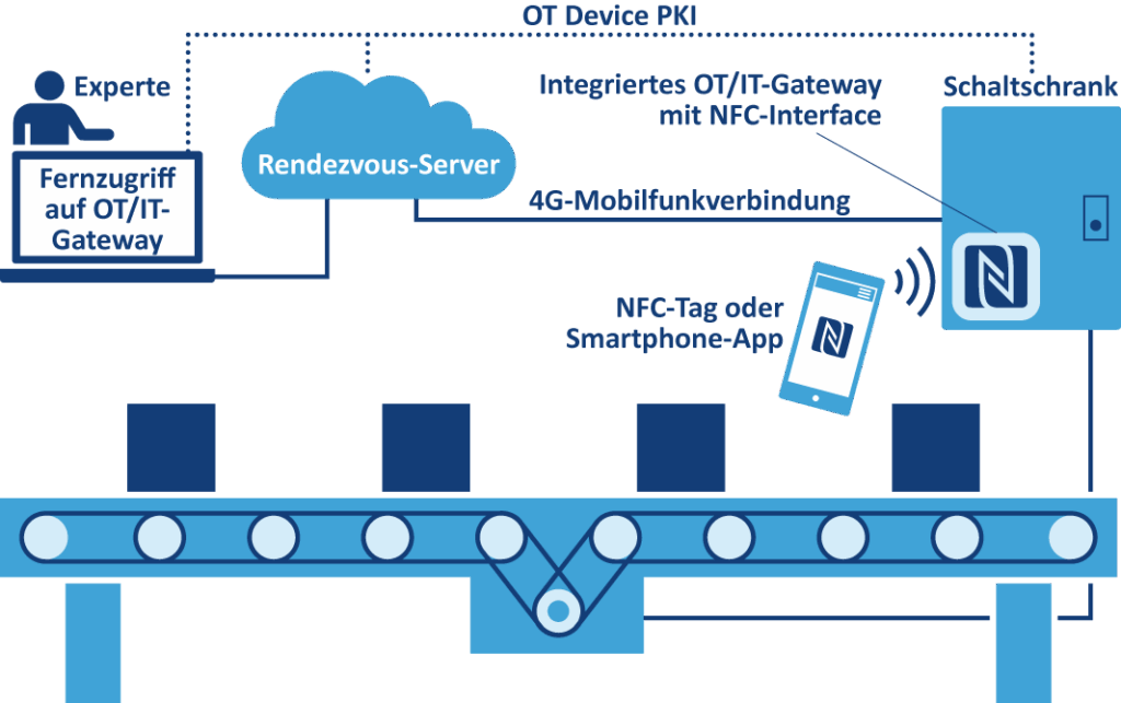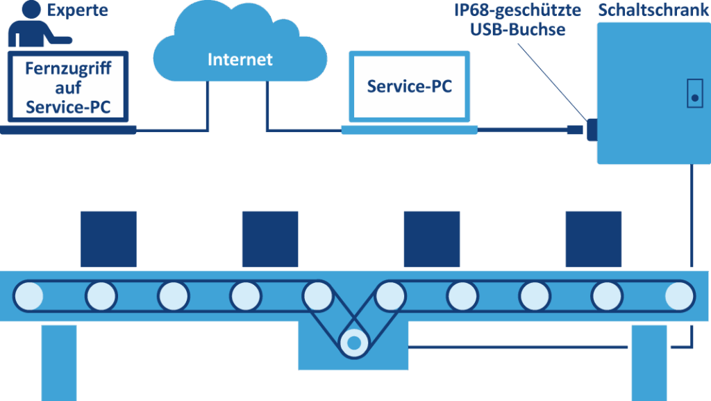 In dem Beispiel einer Förderanlage und verschiedenen Förderelementen für den innerbetrieblichen Materialtransport wird im Servicefall ein Notebook per USB mit dem Schaltschrank verbunden. Auf dem Notebook als Service-PC ist eine SPS-Programmierumgebung plus eine PC-Fernsteuersoftware installiert. Der PC wird über das Anlagenbetreiber-IT-Netzwerk mit dem Internet verbunden, um einem Fernwartungsexperten des Anlagenherstellers den Fernzugriff zu ermöglichen. Nachdem die Fernwartung beendet wurde, wird die USB-Kabelverbindung getrennt und der Service-PC wieder abgebaut.