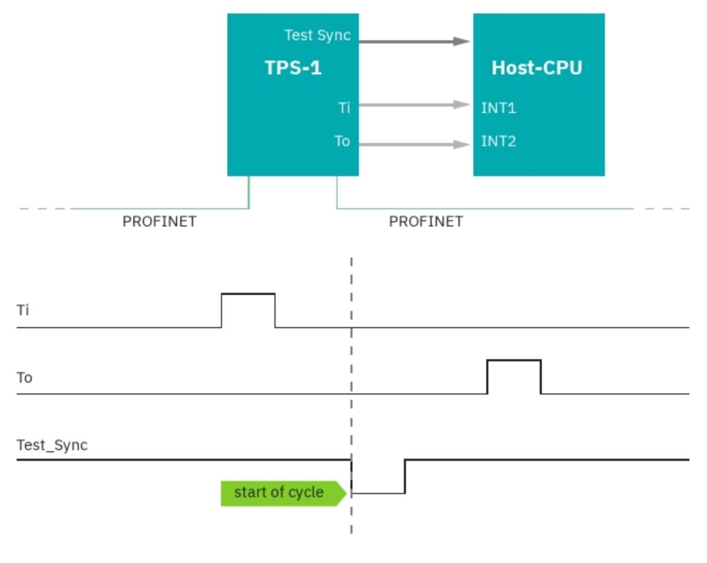 Das Signal Test_Sync zeigt bei der Inbetriebnahme an, dass sich der TPS-1 auf die IRT-Domäne synchronisiert hat. Dieses Signal ist für den Datenaustausch mit der Host-CPU bedeutungslos. Es wird bei der Zertifizierung getestet, um das richtige Verhalten der Synchronisierung zu kontrollieren. Die Signale Ti und To werden der Host-CPU mit dem Ziel zur Verfügung gestellt, dass die laufende Applikation erkennen kann, wann das Gerät Ein- und Ausgangsdaten bereitstellen muss oder wann neue Daten im Gerät angekommen sind. Für einen effizienten Datenverkehr werden die beiden Signale mit Interrupt-Eingängen der Host-CPU verbunden.